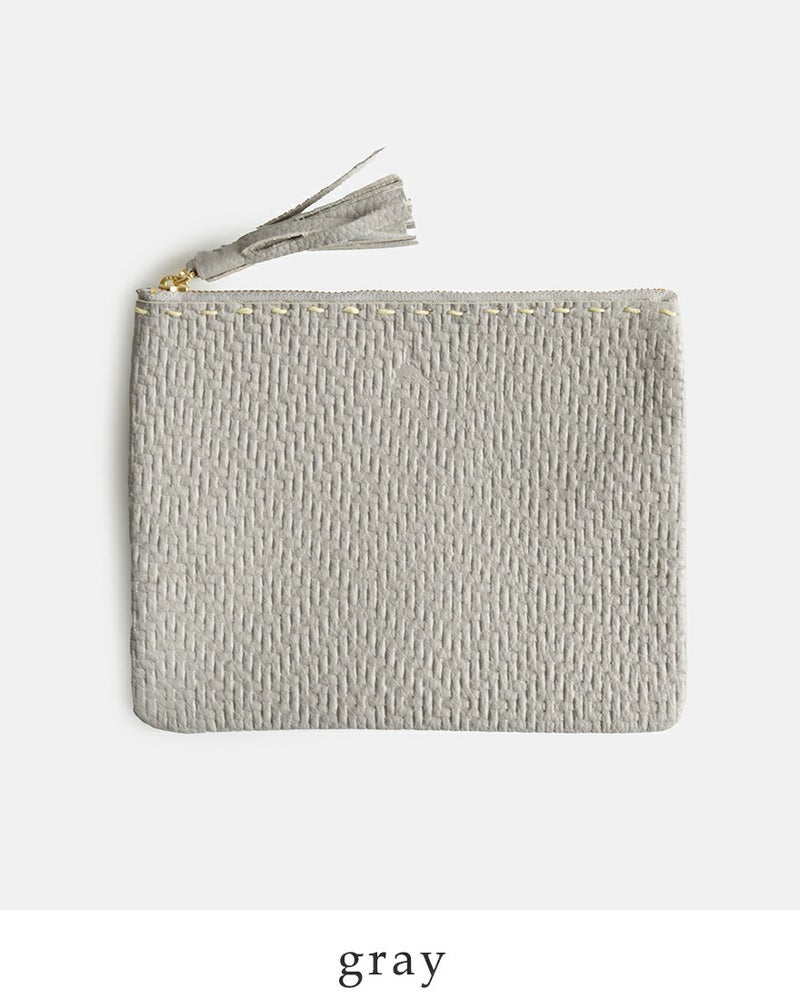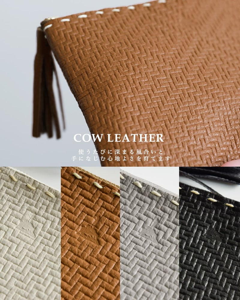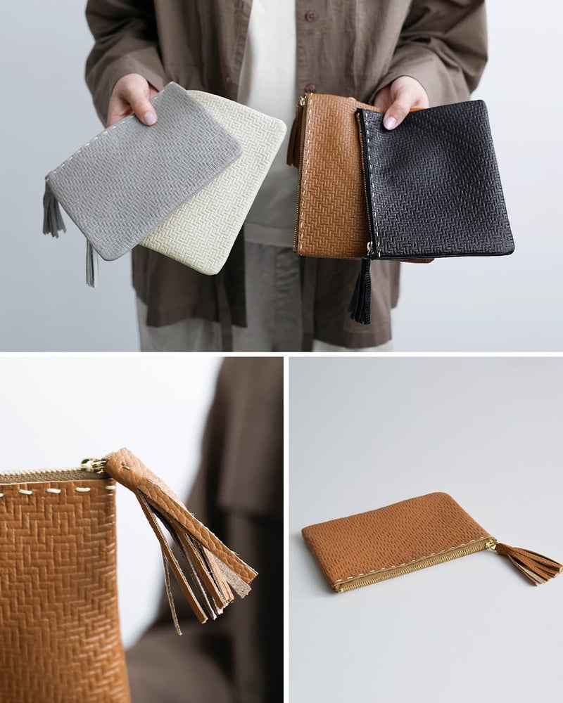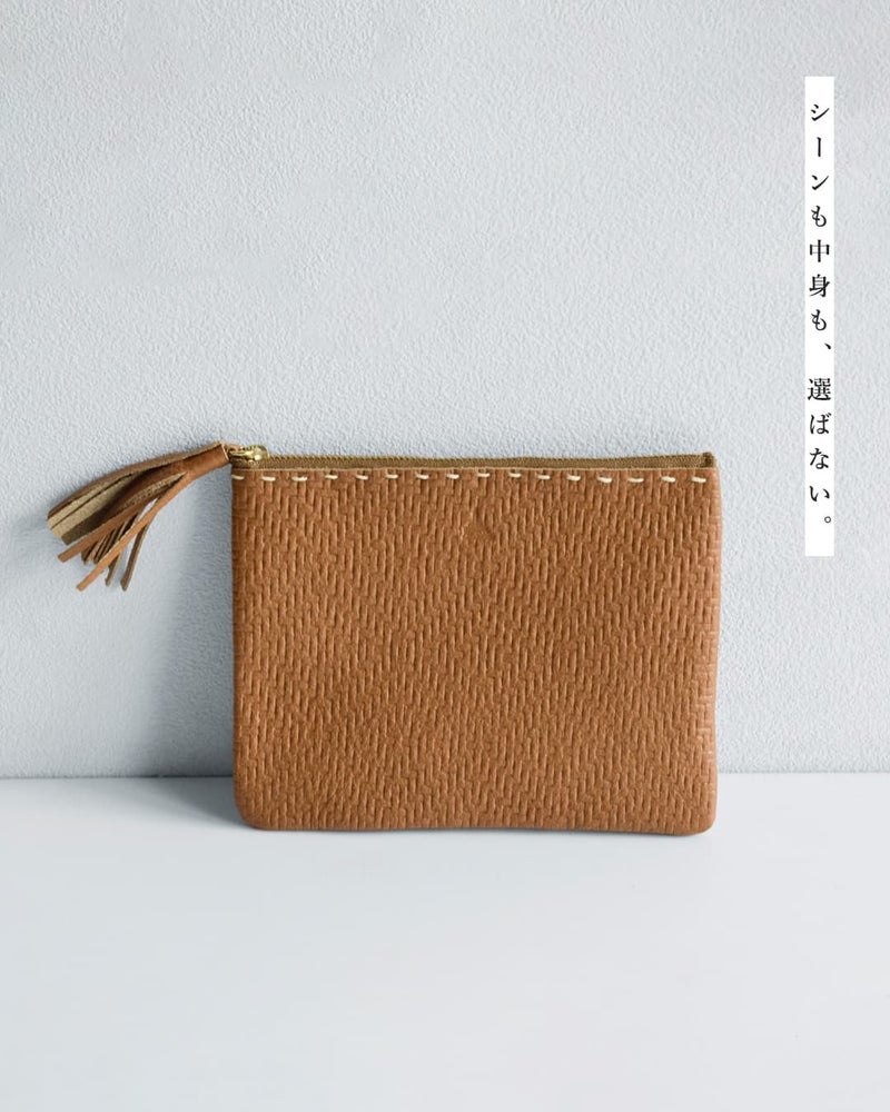 フラットでシンプルなフォルムに、ほのかな型押しとステッチがアクセントを添えます。ジッパーにはレザータッセルがあしらわれ、開閉もスムーズで手元の印象も上品に仕上げています。