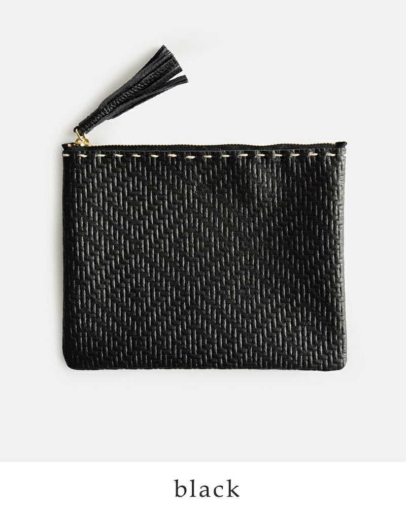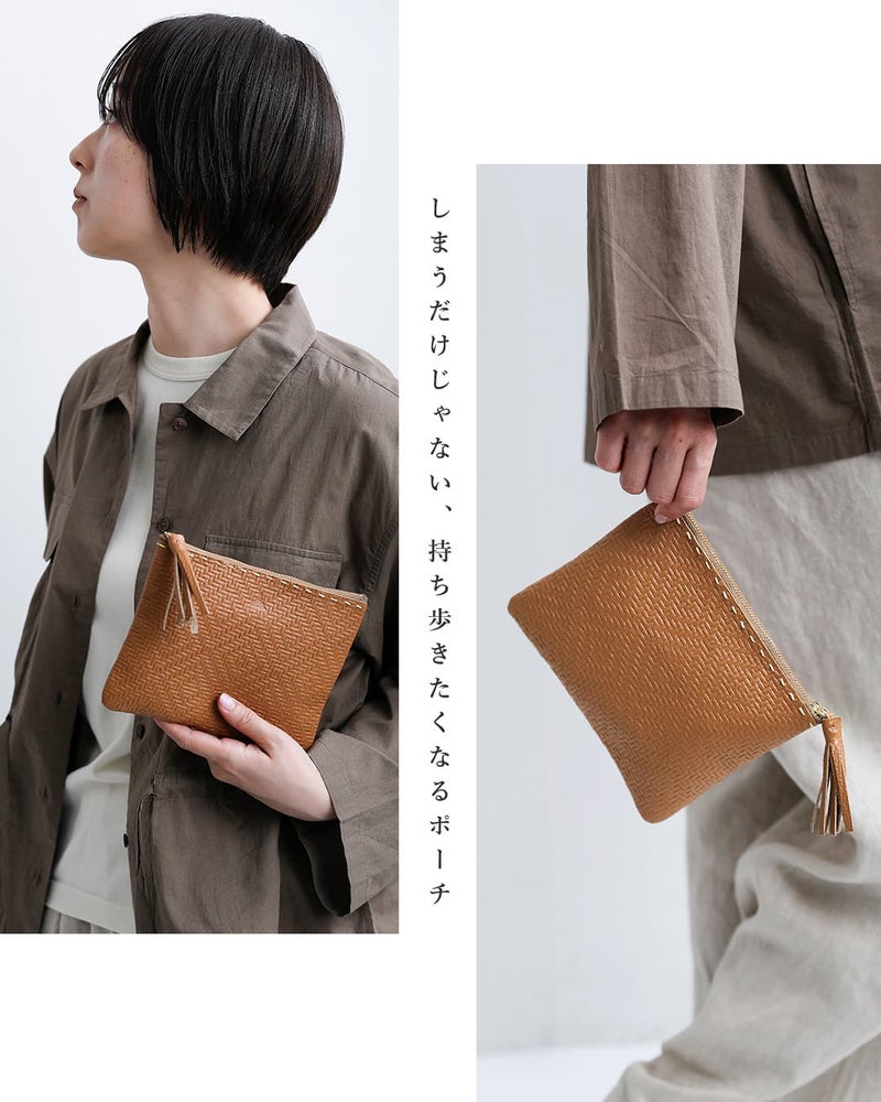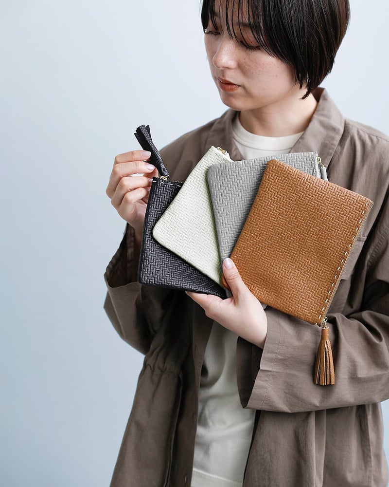 光や動きによって艶や陰影が変化し、シンプルなデザインでも、見る角度で違った印象を楽しめます。同素材のレザータッセルで、ミニマルなポーチにさりげない個性を。