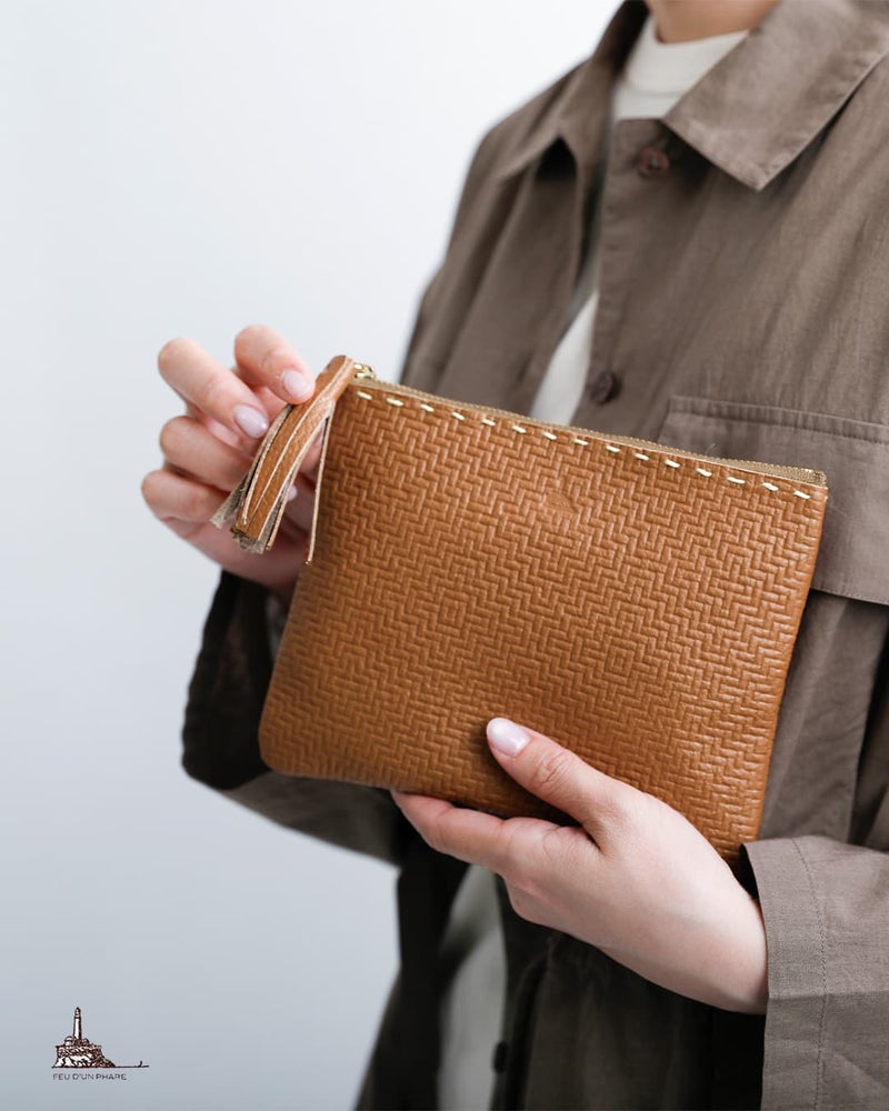 FEU D’UN PHARE(フーダンファール)より、カウレザー型押しポーチ大をご紹介します。上質なカウレザーに、さりげない型押しを施したフラットポーチ。ほのかに浮かぶ模様が、シンプルな中に静かな表情を生み出します。無駄を削ぎ落としたデザインは、入れるものを選ばず、日常のあらゆるシーンに自然とフィット。バッグインポーチとしてはもちろん、そのままクラッチとしても持ち出せる佇まいで、使い方はあなた次第です。毎日使うものだからこそ、手にするたびに感じる質感と、飽きのこない美しさを。何を入れてもサマになる、頼れるポーチです。