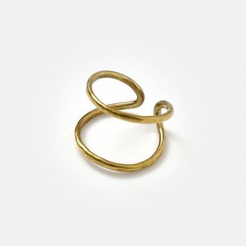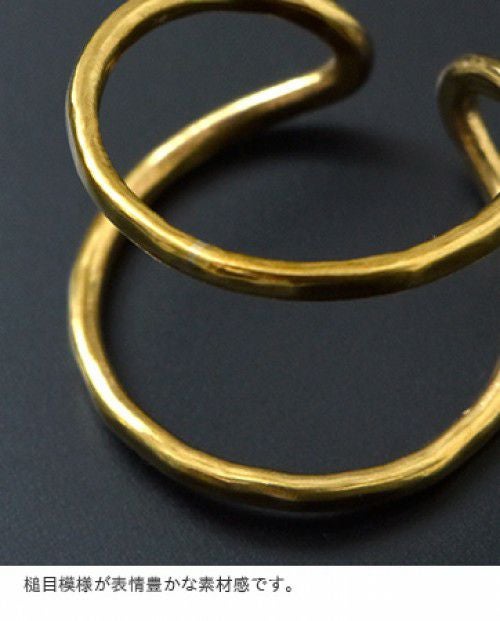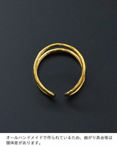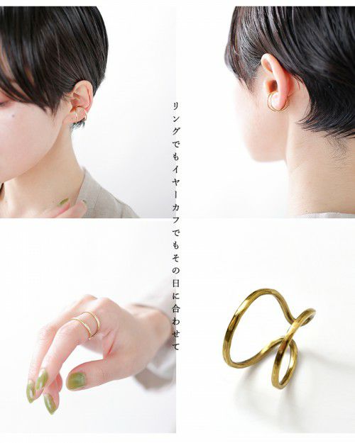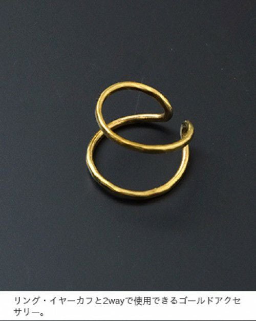 mu/mi(ムミ)より、SENリング&イヤーカフのご紹介です。リング・イヤーカフと2wayで使用できるゴールドアクセサリー。2連で付けているようなデザインがシンプルながら、存在感があるアイテムです。リングは後ろ前どちらでも付けることが可能です。オールハンドメイドで作られているため、曲がり具合等は個体差があります。槌目模様が表情豊かな素材感です。