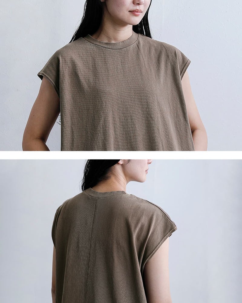 コンパクトな開きのラウンドネック。肩にかかるフレンチスリーブデザインで、二の腕をさりげなくカバーしつつ女性らしい雰囲気に。