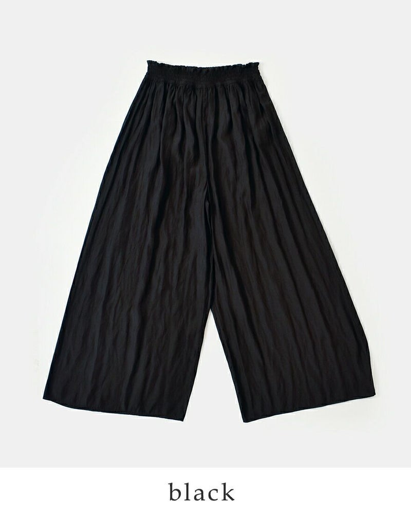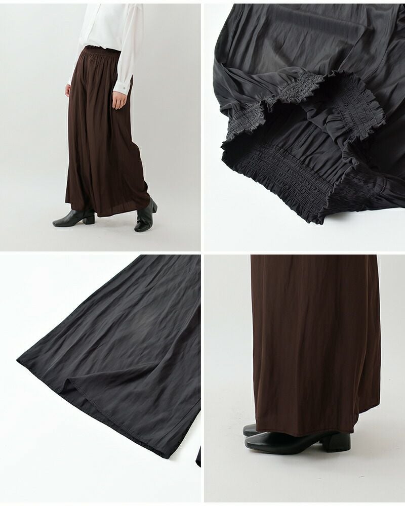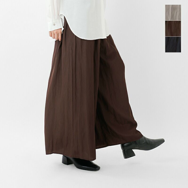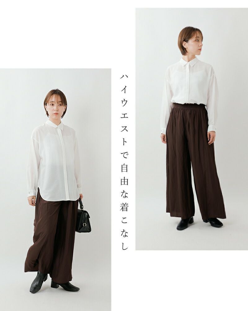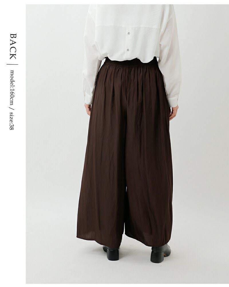 軽やかで上品な落ち感が美しい、ヴィンテージデシン素材のワイドパンツ。程よい光沢と柔らかな風合いが、動くたびに優雅なドレープを描きます。ウエストは全面ゴムシャーリング仕様で、締め付け感なく快適な穿き心地を実現。ゆったりとしたワイドシルエットが脚のラインを拾わず、体型カバー効果も抜群です。ブラウスやニットと合わせればきれいめに、カットソーやスニーカーでカジュアルにも。シーズンを問わず、オンオフ問わず着回せる一本です。