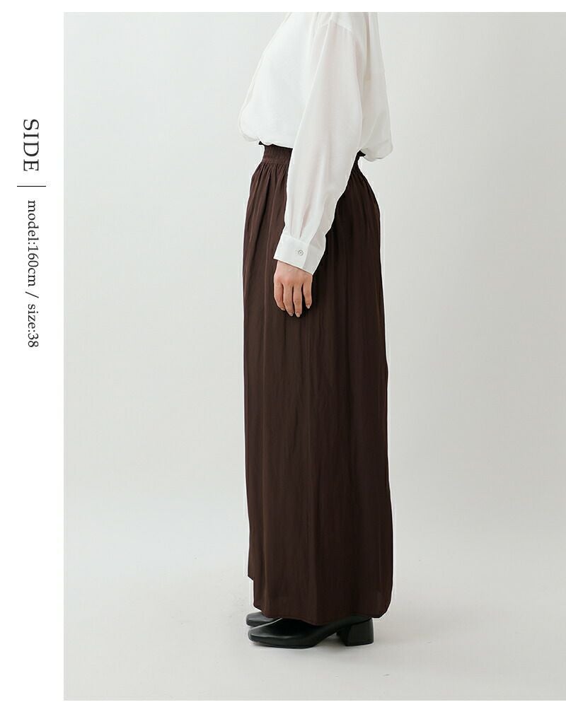 ヒップから裾までゆとりを持たせたシルエットで、体のラインを拾わず、自然に体型をカバー。動きやすさと美しいドレープ感を兼ね備えています。