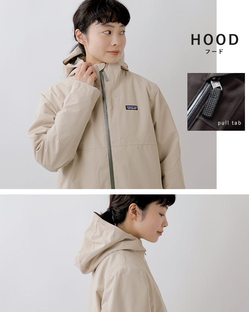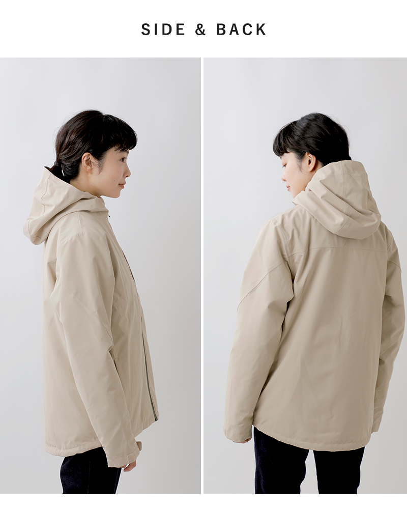 3枚パネル構造のフードは内側にマチを備え、しっかりとフィットし悪天候に対応。首回りの保温性を高めるスタンドアップカラーを採用しています。ジッパーは反射性プルタブ付き。