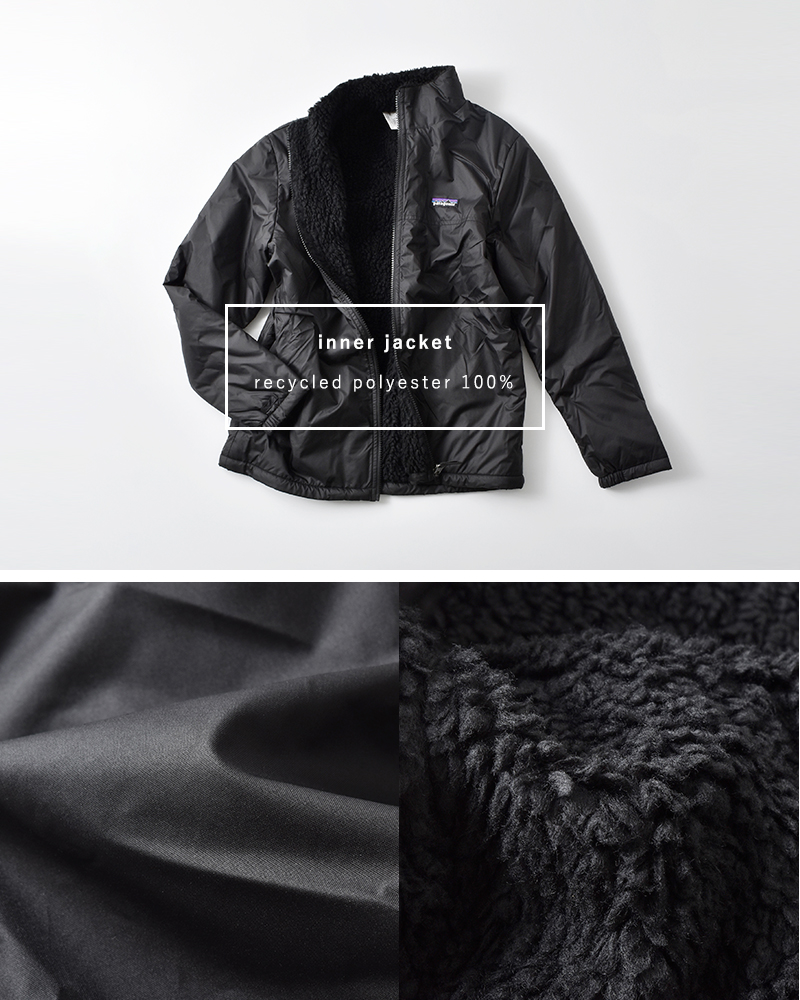 リサイクル・ポリエステル・タフタ100%のシェルはDWR(耐久性撥水)加工済み。身頃に6ミリ厚シアーリング・パイル・フリースを使用しています。