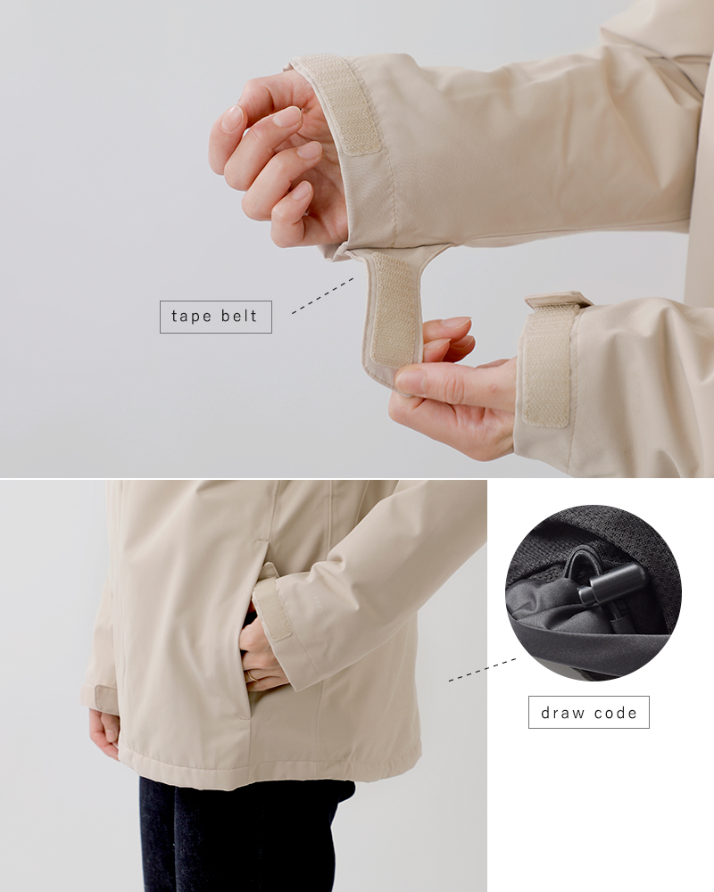 袖口はテープ留めで調節可能。伸縮性の袖口はかさばりを抑えながら風の浸入を防ぎます。ストレートな裾はドローコードでフィット感の調節が出来ます。