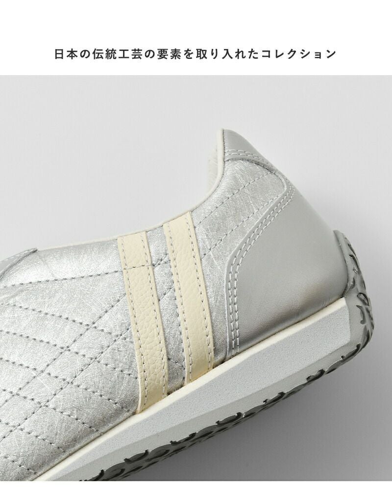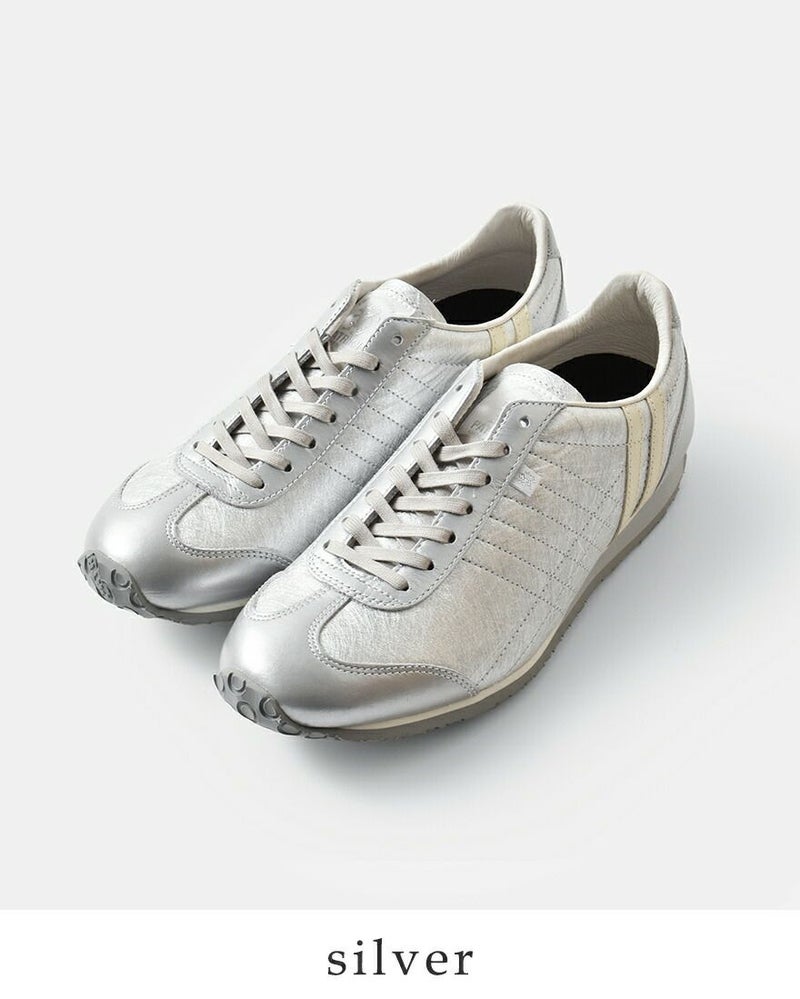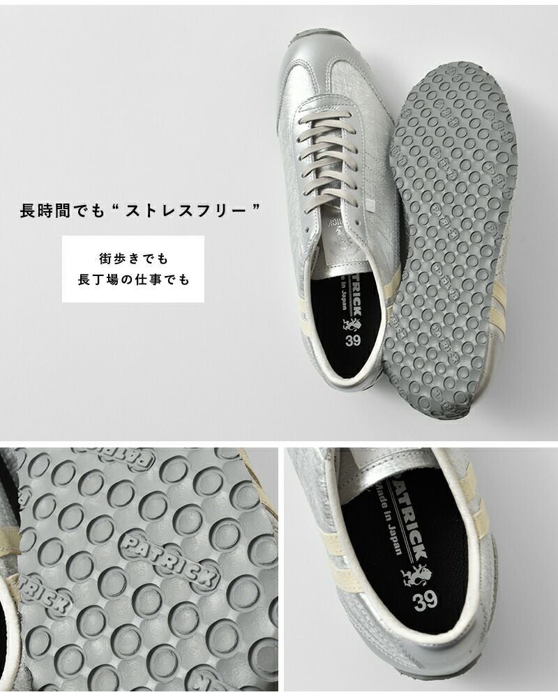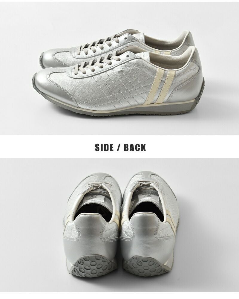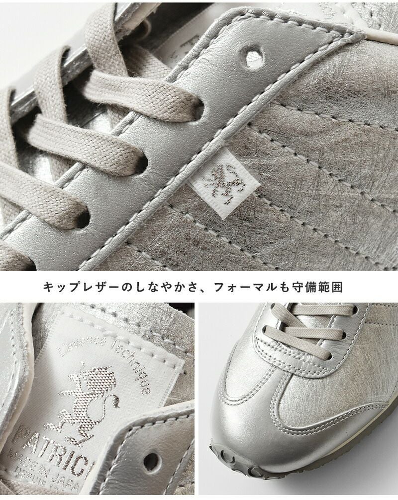 PATRICK(パトリック)より、パミール ハク レザーアッパー ローカット スニーカー “PAMIR-HAKU”のご紹介です。本物の和紙から型を取った箔加工が、光の角度で表情を変える上質な存在感。控えめなのに主張する、この唯一無二の輝きこそ“日本の美”を宿したパトリック流モダンデザインです。アッパーは足馴染みの良いキップレザーを採用。走れる革靴級の軽快さと、メタリック補強が生む上品な強度。オールシーズン、ビジカジ問わず活躍する万能仕立ての実用美モデル。レザー特有の包み込まれるフィット感に加え、箔部分は見た目に反して驚くほどなめらか。街歩きでも、長丁場の仕事でも、気取らず堂々と履けるパフォーマンスを発揮します。