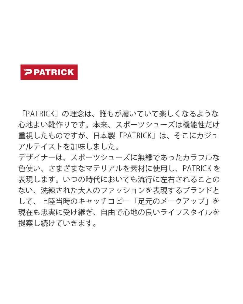「PATRICK」の理念は、誰もが履いていて楽しくなるような 心地よい靴作りです。本来、スポーツシューズは機能性だけ 重視したものですが、日本製「PATRICK」は、そこにカジュ アルテイストを加味しました。 デザイナーは、スポーツシューズに無縁であったカラフルな 色使い、さまざまなマテリアルを素材に使用し、PATRICK を 表現します。いつの時代においても流行に左右されることの ない、洗練された大人のファッションを表現するブランドと して、上陸当時のキャッチコピー「足元のメークアップ」を 現在も忠実に受け継ぎ、自由で心地の良いライフスタイルを 提案し続けていきます。
