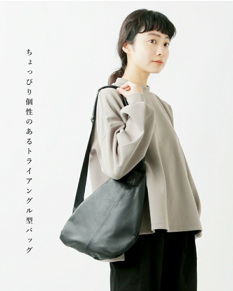 POMTATA(ポンタタ)カウレザーより、 ボディバッグ “CANDY SERIES”をご紹介します。トライアングル型のシルエットが個性的な印象のボディバッグ。素材には品のある牛革を使用しているのでコーディネイトを引き締めてくます。シンプルなコーディネイトにひとつ取り入れるだけで秋冬らしいモードな雰囲気にまとまります。
