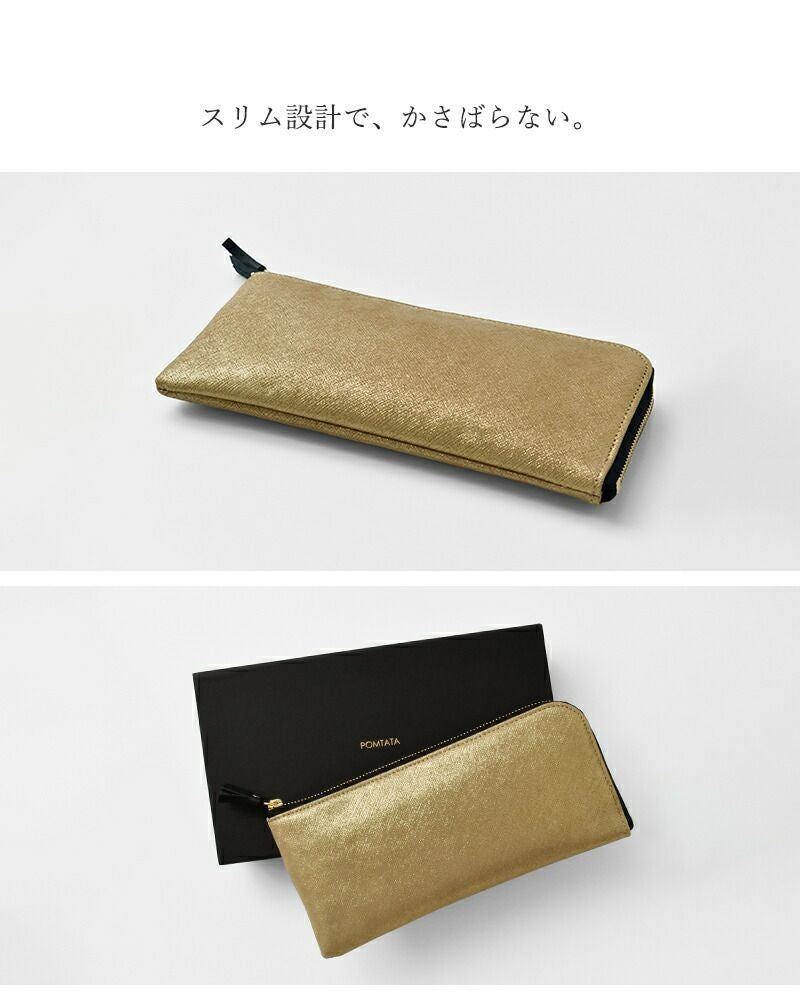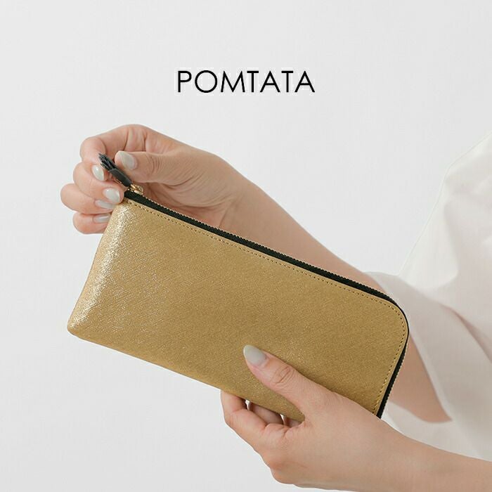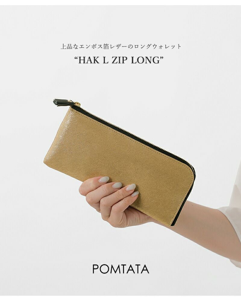 POMTATA(ポンタタ)より、エンボス 箔レザー Lジップ ロング ウォレット “HAK L ZIP LONG”のご紹介です。繊細な質感の箔レザーを表面に使用した雰囲気のあるロングウォレット。側面をぐるりと覆うL字のゴールドファスナー、持ち手に小振りなフリンジチャームが付いています。スリムなフォルムながら、見た目以上の収納力を実現。カード類や紙幣、小銭までしっかり収まり、日常使いに十分な容量をスマートに備えています。かさばらず、バッグの中でもすっきり収まるのが魅力です。