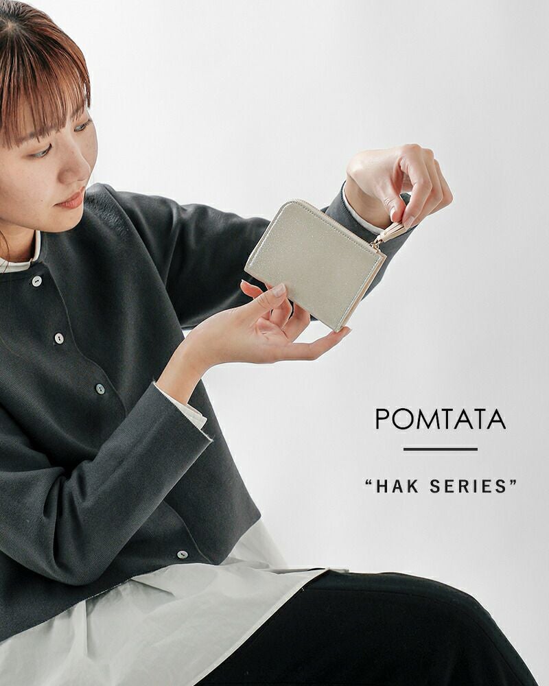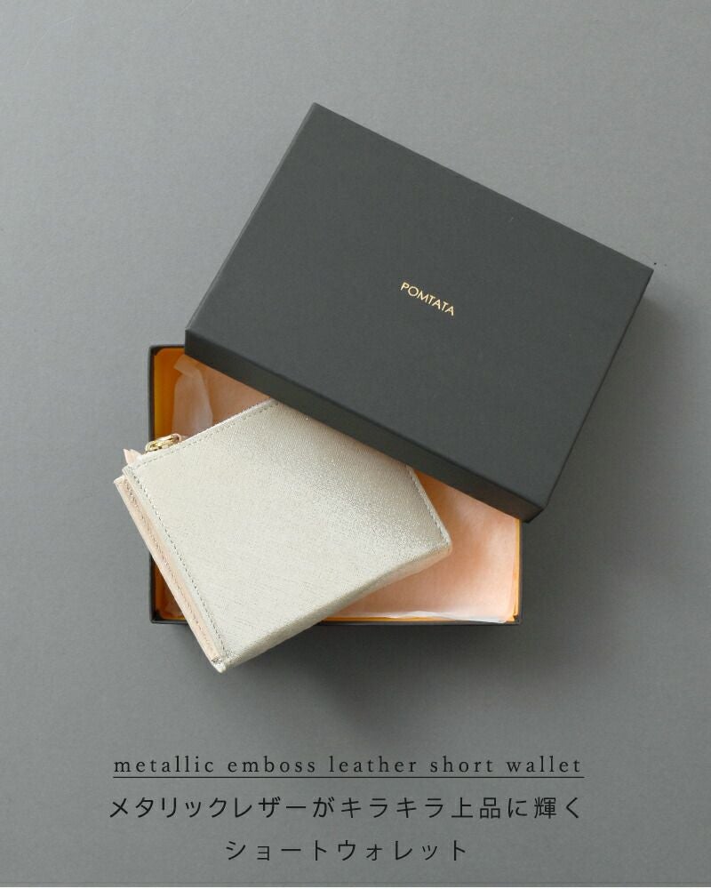 POMTATA(ポンタタ)よりエンボスレザーLジップショートウォレット“HAK SERIES”のご紹介です。繊細な質感のサテン生地のようなメタリックレザーを表面に使用した、雰囲気のあるショートウォレット。カードポケットも完備して小さいながら収納力があります。トレンドのミニバッグとも相性抜群。シンプルながらも華やかで上品な印象のウォレットです。