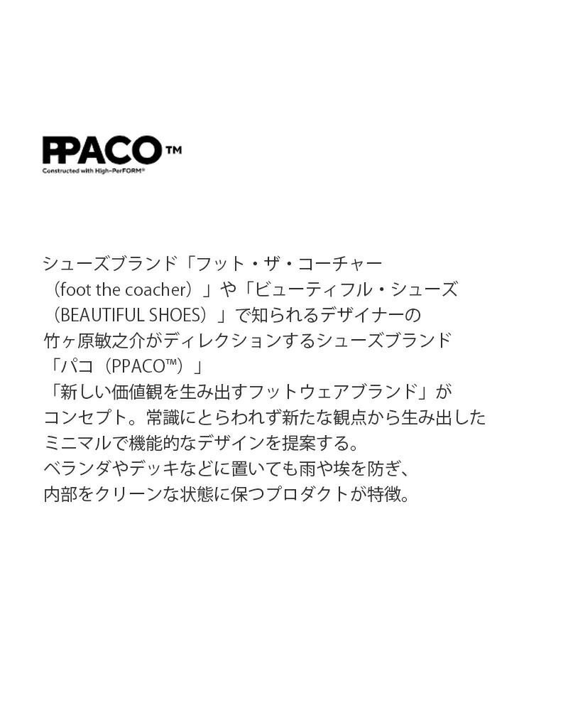 シューズブランド「フット・ザ・コーチャー(foot the coacher)」や「ビューティフル・シューズ(BEAUTIFUL SHOES)」で知られるデザイナーの竹ヶ原敏之介がディレクションするシューズブランド「パコ(PPACO)」。「新しい価値観を生み出すフットウェアブランド」がコンセプト。常識にとらわれず新たな観点から生み出したミニマルで機能的なデザインを提案する。ベランダやデッキなどに置いても雨や埃を防ぎ、内部をクリーンな状態に保つプロダクトが特徴。