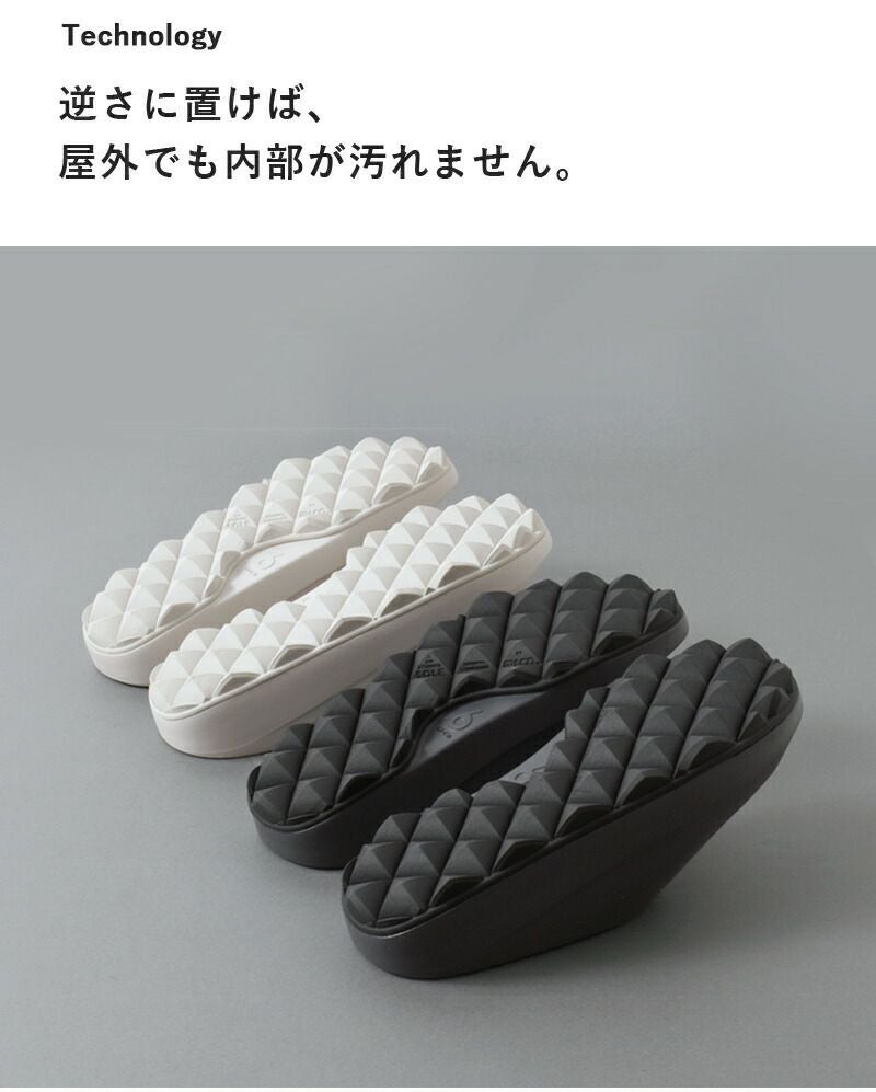 “Overturn common sense. (常識をひっくり返そう)”をテーマに掲げた今シーズンのアイテムは、直線的な履き口の形状により文字通り裏返すことが可能で、ベランダやデッキなどに置いても雨や埃を防ぎ、内部をクリーンな状態保てるのが特徴的です。