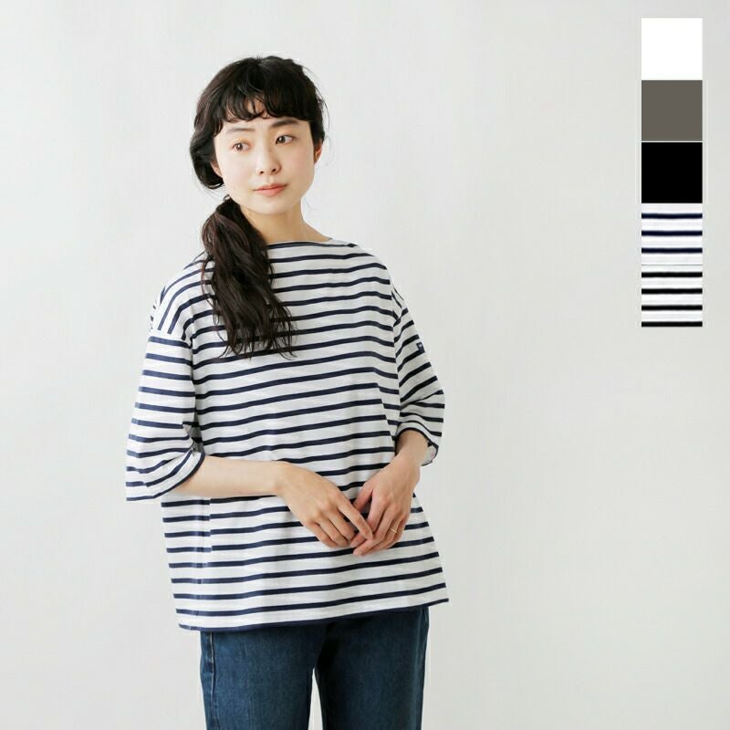 ボートネック。シンプルながら首元の表情がファッション性を高める襟元。左袖に配置したセントジェームスのタグがアクセントに。