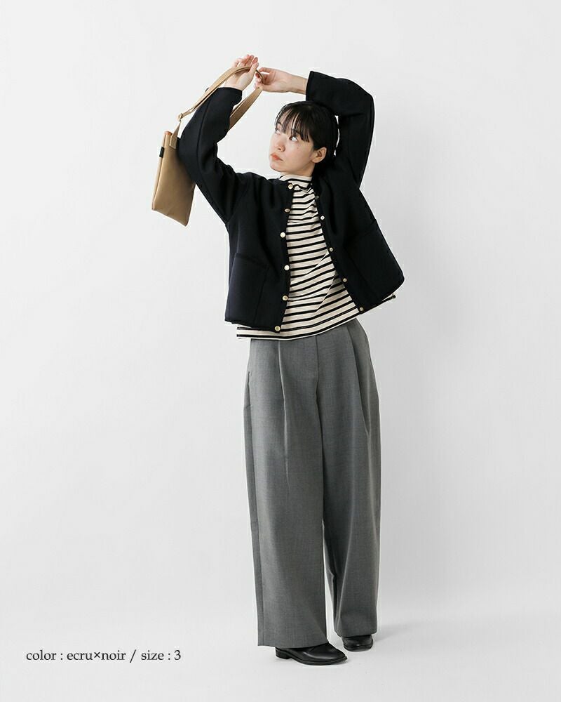 セントジェームスといえばこの形といってもいいくらい定着しているボートネック。詰まったコンパクトなネックラインですが、窮屈な感じがしません。横から見ると首筋を長く見せてくれる魔法のシルエット。