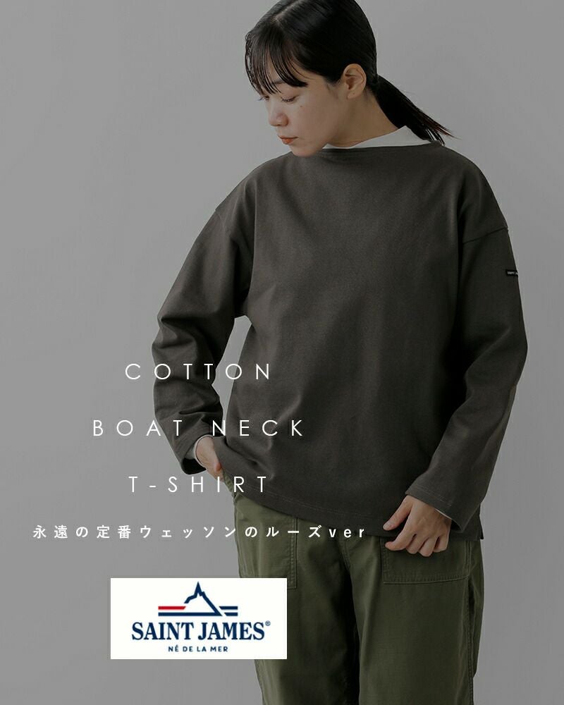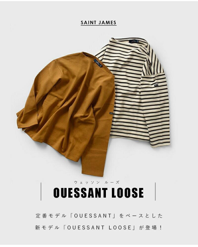 SAINT JAMES(セントジェームス)よりコットン ボートネック ウェッソン ルーズ Tシャツ “OUESSANT LOOSE”のご紹介です。定番バスクシャツ「ウエッソン」をベースに、ゆったりとしたシルエットでデザインされたモデル。身幅と袖幅にゆとりを持たせたことで、抜け感のあるフェミニンなシルエットとなっております。着込む程に身体に馴染んでいく目の詰まった素材感は変わらず、1年を通して長く着用できるアイテム。豊富なカラー展開も魅力で、お持ちのアイテムとぴったりなカラーがきっと見つかる13色展開。