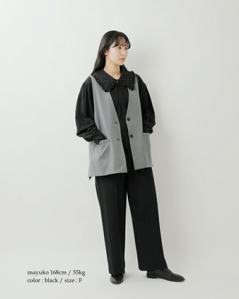 華やかで印象的な、大きな襟。襟に挟み込まれた小さなフリルが繊細で、可愛らしいポイントです。1番上のボタンがなく、V開きにした胸元が抜け感を加えます。