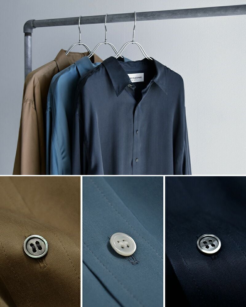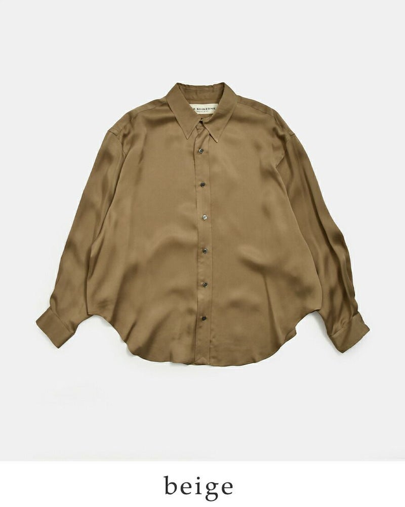 Shinzone(シンゾーン)より、シルキー キュプラ シャツ SILKY CUPRA SHIRTのご紹介です。 定番のDADDY SHIRTのシルエットはそのままに、フィブリル加工を施したキュプラ100%のサテンを採用し、より上品な印象に仕上げました。フィブリル加工によって生まれるやわらかな風合いとシルキーな肌触り、ほどよい厚みと落ち着きのある光沢が、大人の余裕を感じさせ、洗練されたムードを演出します。