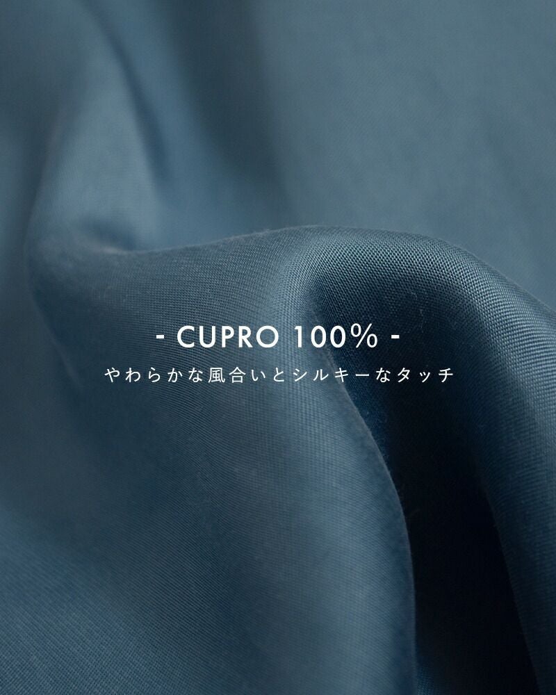 キュプラサテンのやわらかな艶と美しい落ち感が、シンプルな装いにさりげない奥行きをプラス。大人の余裕を感じさせる一枚です。