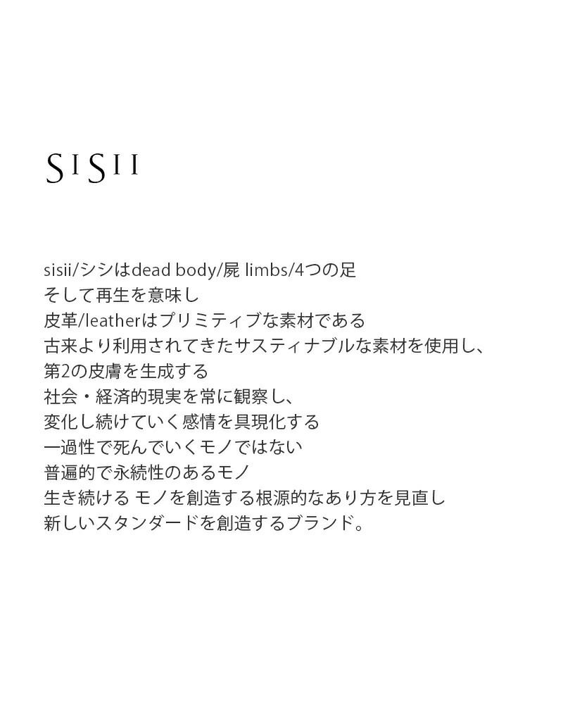 Sisiiはタイムレスに存在する。着る人の日常のなかに。 洗練されたデザインと選び抜かれた素材で形成されるSisiiは、 普遍性と自由さを備え、新たなスタンダードを表現する。 国内の自社工場でレザー職人が特別な『なめし』を施した革は、 ラフでありながら、エレガントな存在感をまとう。 ちょっとした旅行のときに、鞄にくしゃっと詰めていくような。 本当に必要なものとして、Sisiiは在ります。