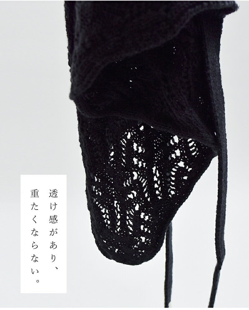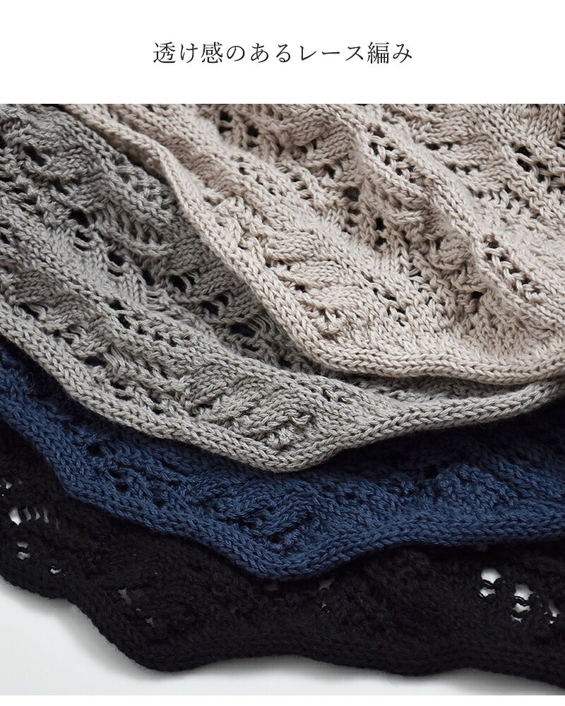 天然繊維ならではのやさしい肌あたりで、チクチク感の少ない快適な着け心地。 透かし編みの表情が軽やかさを生みだします。 ナチュラルな質感と扱いやすさを兼ね備えた、デイリーに頼れる素材です。