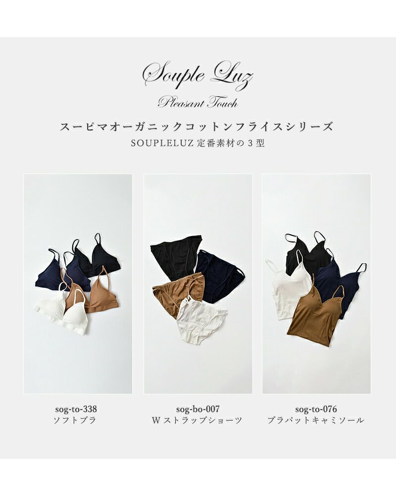 フランス語でしなやかさを意味するSouple ポルトガル語で光を意味するLuz この2つの言葉をあわせてSoupleLuz(スープレルース) オーガニックコットンをベースに、シンプルでシックにデザインし 肌触りの良い贅沢な素材使いで 一度身につけたら手放せない極上の肌触りを提供します。 “女性の身だしなみとして、エレガントなものを身につけること” をコンセプトに、オーガニックコットンと メイドインジャパンにこだわったプロダクトです。