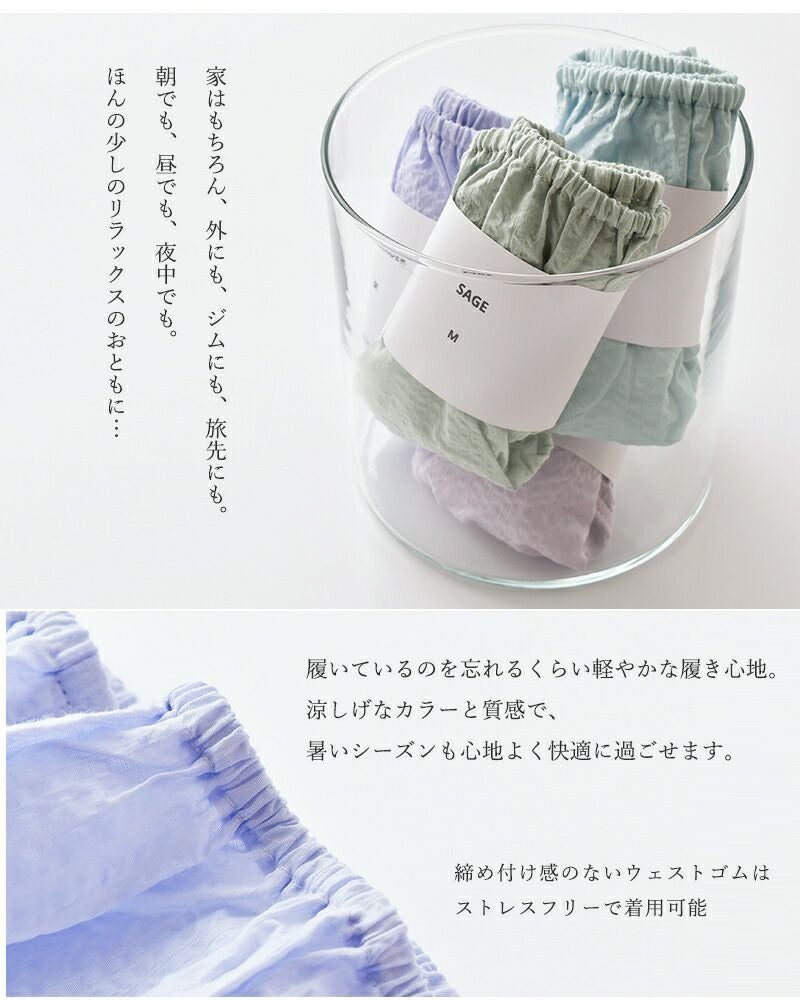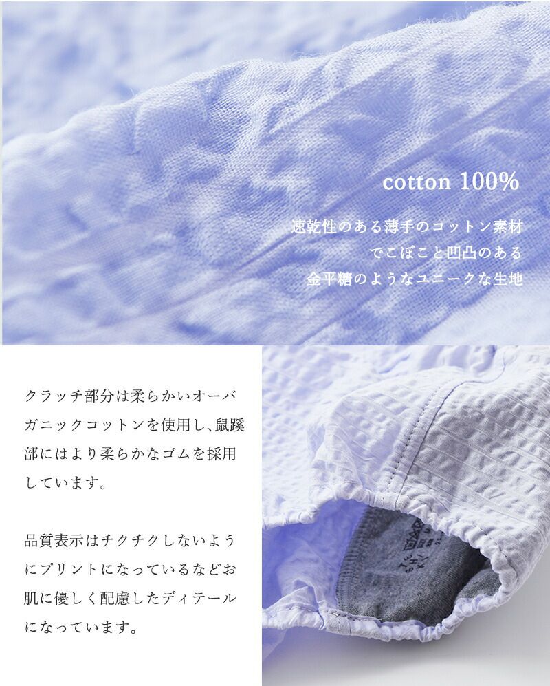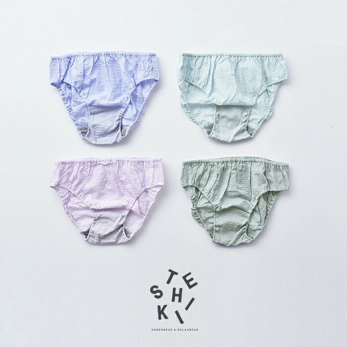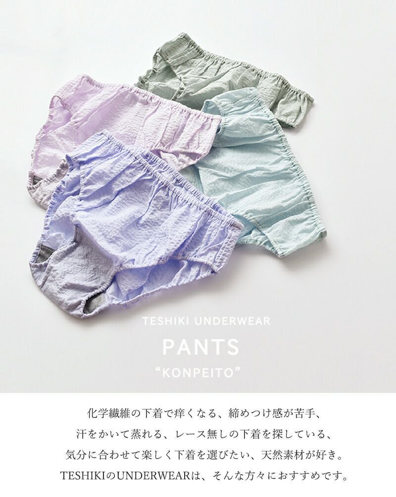 TESHIKI(テシキ)より、アンダーウェア コットンパンツ“KONPEITO”をご紹介します。化学繊維の下着で痒くなる、締めつけ感が苦手、汗をかいて蒸れる、レース無しの下着を探している、気分に合わせて楽しく下着を選びたい、天然素材が好き。TESHIKIのUNDERWEARは、そんな方々におすすめです。涼しげなカラーと質感で、暑いシーズンも心地よく快適に過ごせます。