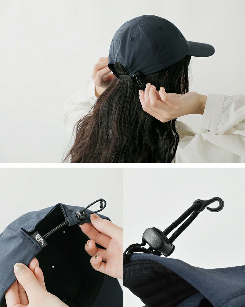 後ろにアジャスターが付いているので髪形やスタイリングにあわせて自由に調性できます。ぎゅっとかぶってもゴムなので脱着は楽ちん♪先端に取り付けられたフックにより、ザックやベルトなどに簡易的につなげることが可能です。