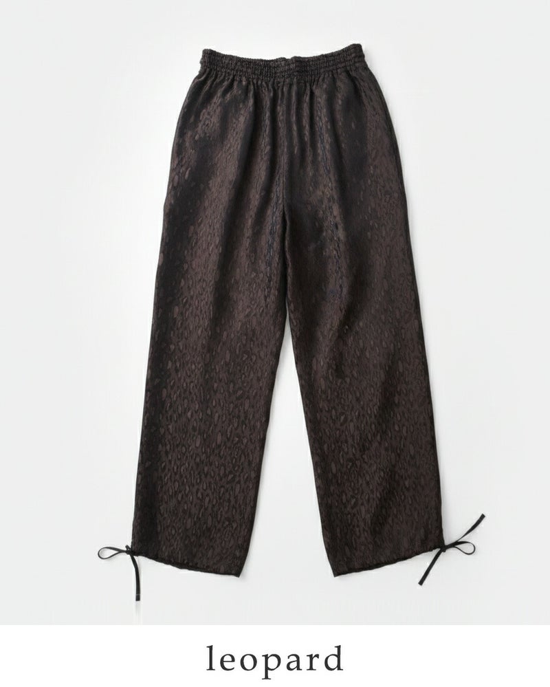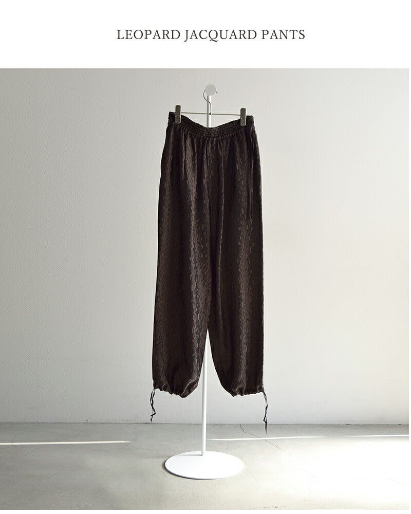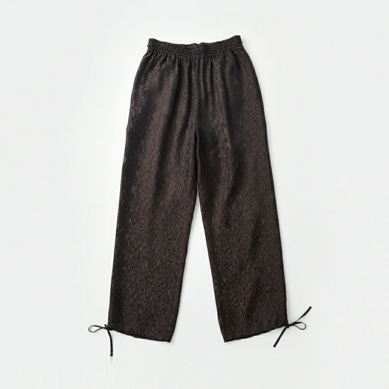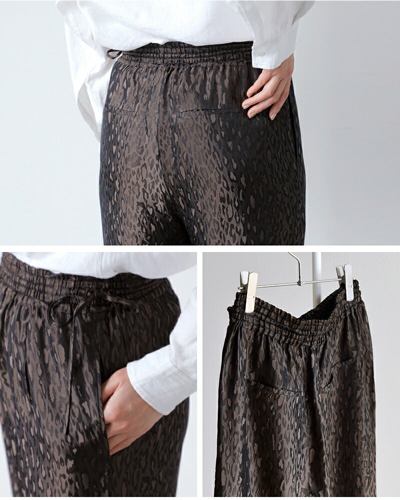 TICCA(ティッカ)より、レオパード ジャガード パンツ をご紹介します。 上品なレオパード柄と光沢のあるジャガード生地が大人の遊び心を演出する一枚。 程よくゆとりのあるストレートシルエットで体型をカバーしつつ、動きやすく快適。 ウエストは総ゴム+ドローコードで着脱も調整もラクラク。 柔らかなキュプラ素材が自然な落ち感とドレープを生み、日本製の丁寧な縫製で長く愛用できます。 デイリーからお出かけまで幅広く活躍する、大人のためのレオパードパンツです。