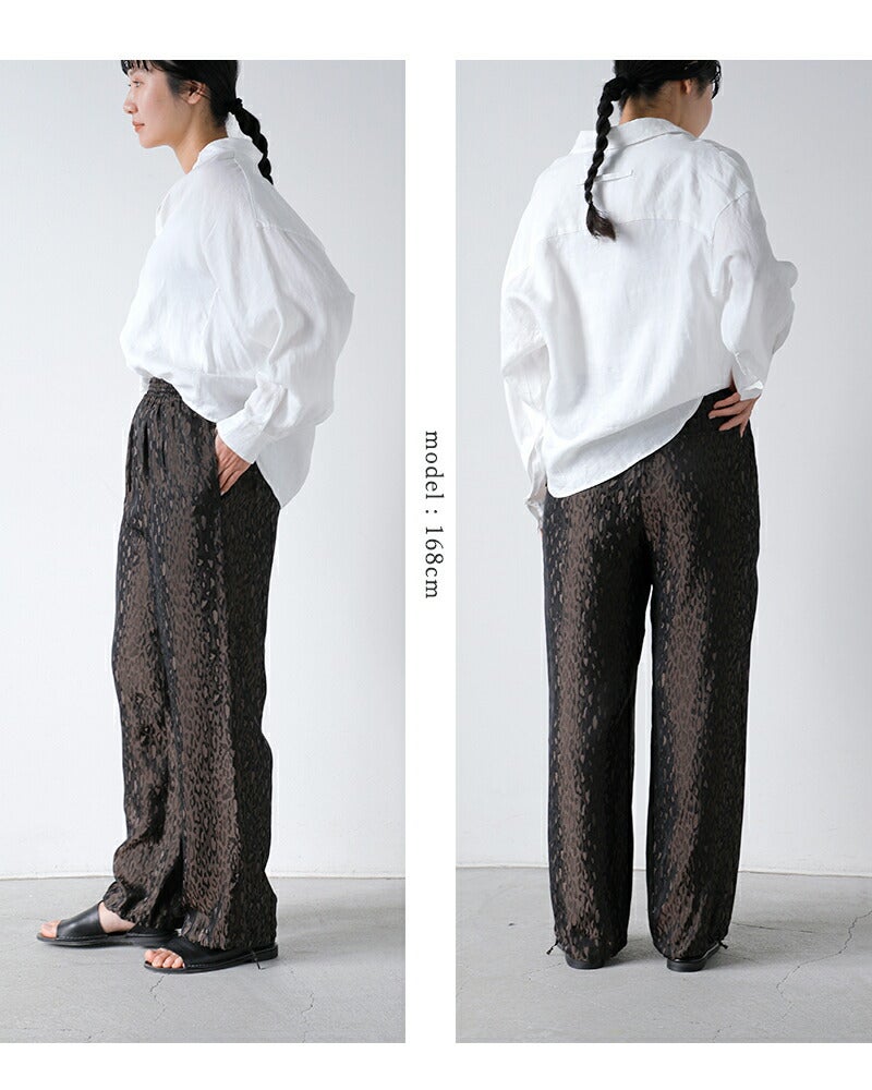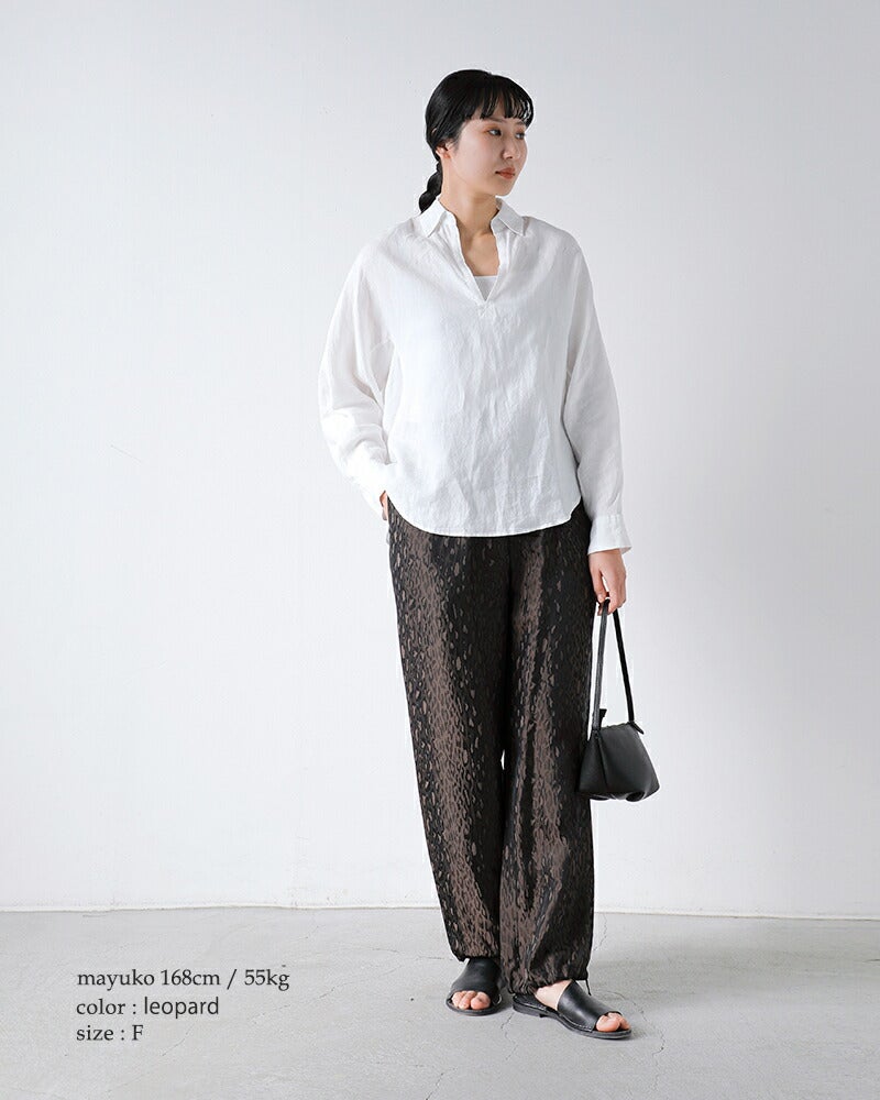 キュプラ混の生地を使用し、滑らかな光沢感と軽やかな着心地を実現。 肌触りもよく、長時間でも快適に過ごせる一枚。 落ち着いたトーンのレオパード柄を採用。上品に映えるレオパード柄。光の角度で表情が変わる織り柄が、コーディネートに華やかさを添えます。 派手すぎず、コーディネートのアクセントとしてさりげなく存在感を発揮します。