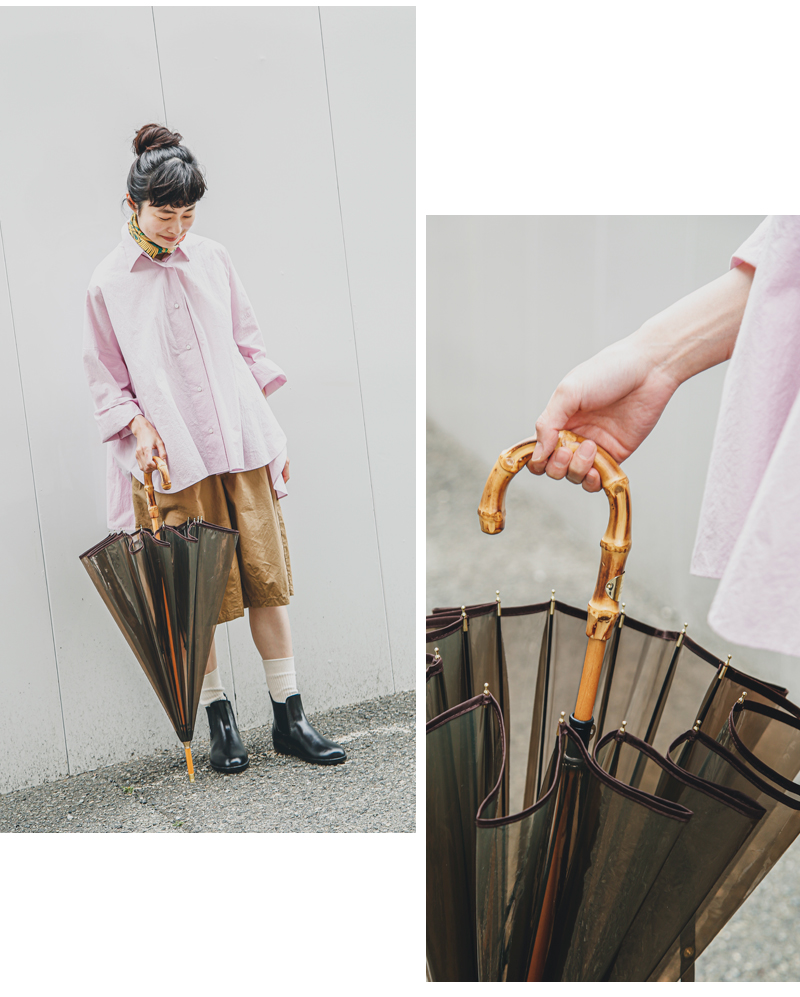 デイリーな印象のビニール素材にクラシックなバンブーハンドルを掛け合わせることで、上品でモダンなビニール傘へと昇華。エレガント過ぎず、カジュアル過ぎず、どこか上品さを感じる雰囲気が特徴。実はどんなスタイルにもはまる汎用性の高いデザインです。