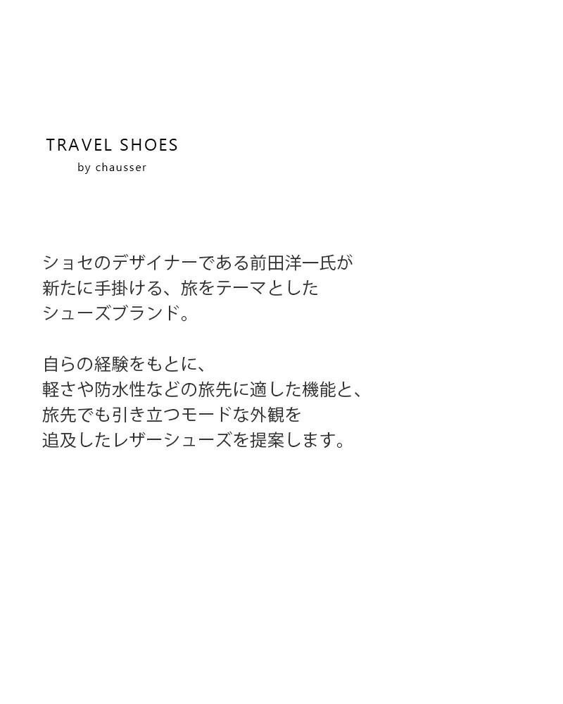 TRAVEL SHOES by chausserトラベルシューズバイショセは、ショセのデザイナーである前田洋一氏が新たに手掛ける、旅をテーマとしたシューズブランド。軽量で携帯しやすく、旅行先での様々なシチュエーションに対応可能な機能とデザインを取り入れたシューズを展開。日常の装いにも取り入れられるデザインを兼ね備えたシューズを提案しています。
