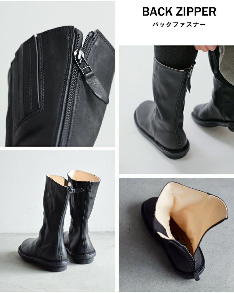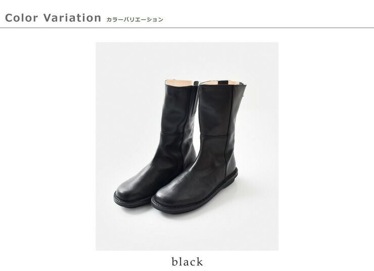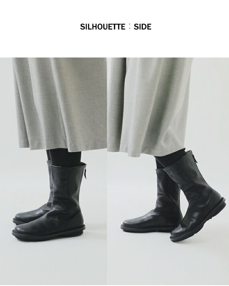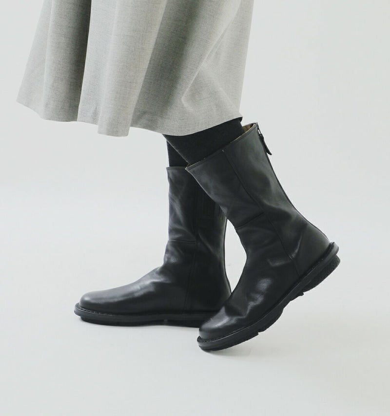 trippen(トリッペン)より、カウレザー ミドル ブーツ をご紹介します。インサイドにジップファスナーが使用されたミディアム・ハイのアンクルブーツ。シンプルなブラックですが、歩くたびに見える内側のステッチがアクセントに。また、丸みのあるやさしげな曲線のラウンドトゥが女性らしい柔らかさをキープしてくれます。スカートにもパンツにもどちらにも合わせやすいので秋冬に一足あると安心です。