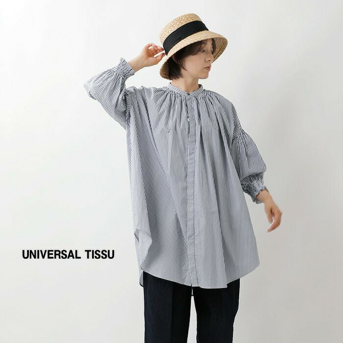 universal tissu(ユニヴァーサルティシュ)より、フレンチリネン / コットン トリプル シャーリング ブラウスのご紹介です。定番素材のコットンタイプライターとリネンを使用した、ふんわりギャザー使いがかわいいチュニックです。襟元と袖口にシャーリングを施し、細かいギャザーがふわっとリラクシングなシルエットを演出します。チュニック丈なので、パンツとのレイヤードもお楽しみいただけ、前開きで羽織としても着用いただけるアイテムです。