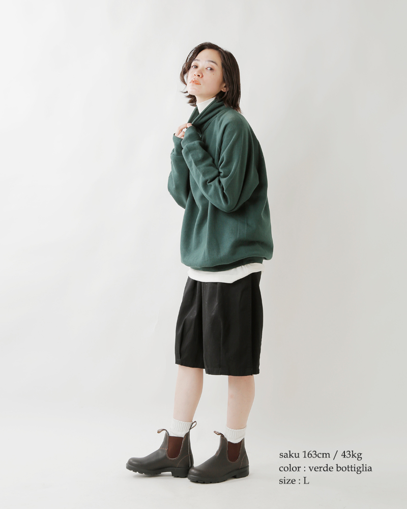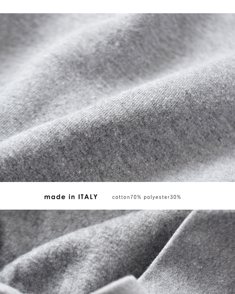 コットン70%ポリエステル30%の裏起毛スウェットです。ふっくらとした肉感があり、きれいなボリュームシルエットを表現します。裏面は裏起毛で、保温効果もしっかりあり、真冬も暖かく着ていただけます。イタリア製にこだわった高品質な生地で、長くご愛用いただけます。