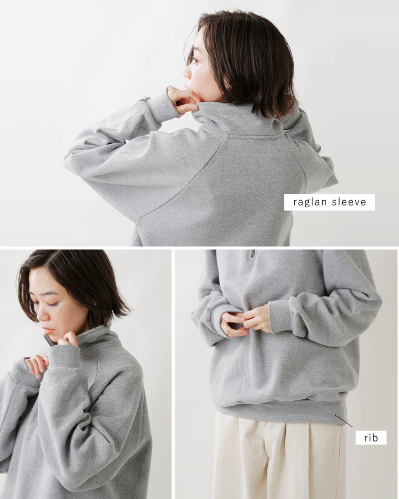 袖付けは、ラグランスリーブ仕様です。オーバーサイズで着ても、肩幅が強調されずすっきりとした見た目でスマートに着て頂けます。裾のリブが体にフィットするので、ボトムスのボリュームに合わせて、着丈の位置を調整していただけます。