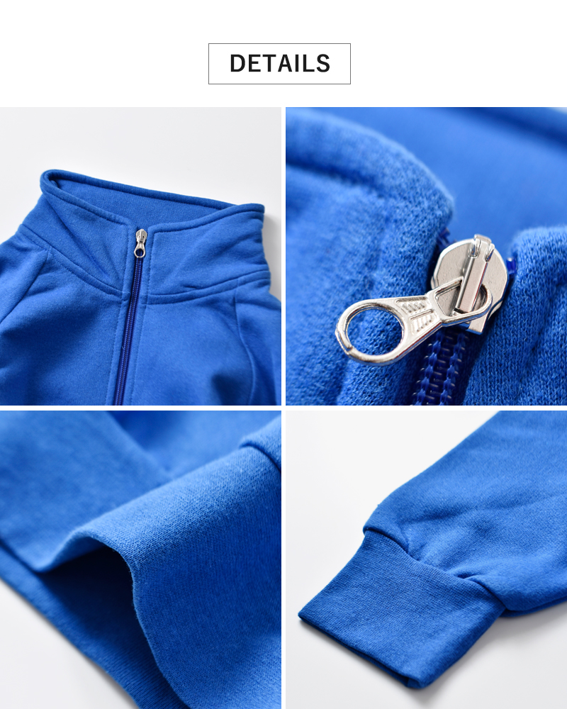 襟はジップ付きのプルオーバーデザインです。深すぎないハーフジップが特徴。極端な高さがないので、スタンドカラーでも、襟を開けて着ても、どちらもお楽しみいただけます。