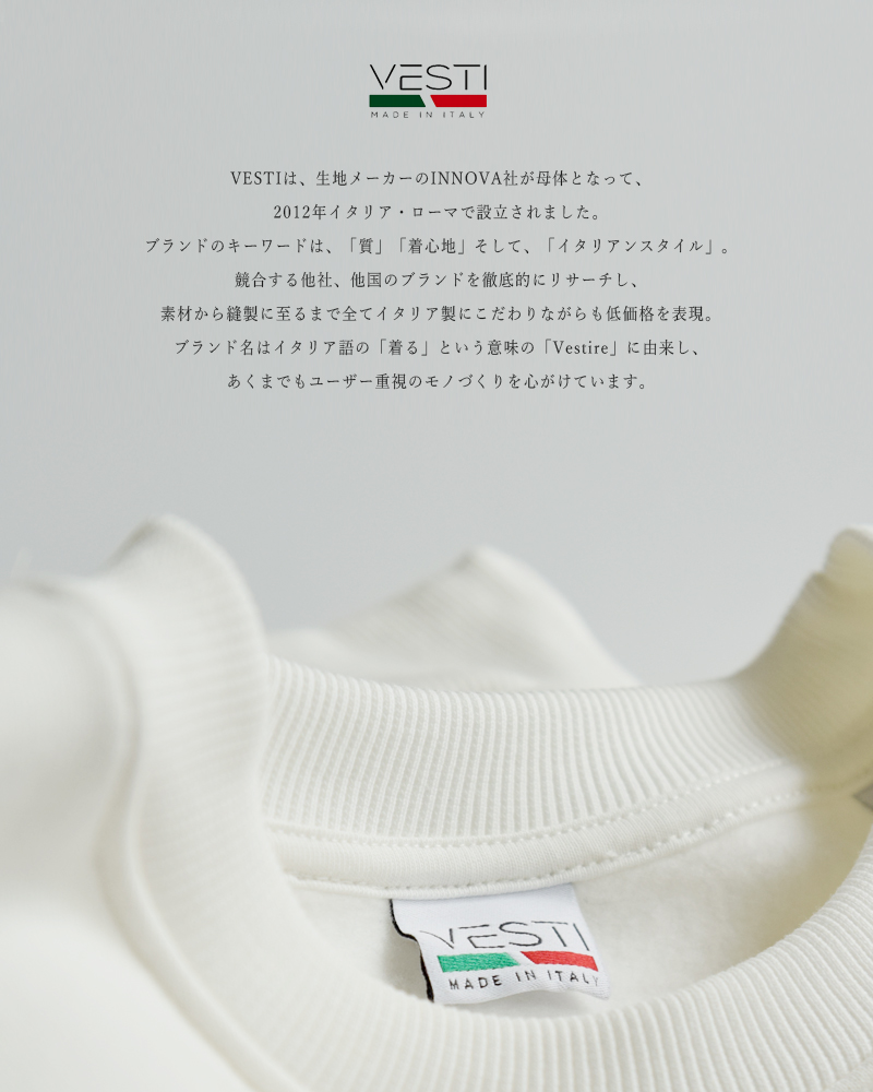 アスレチックウェアの生地製造メーカーから誕生したイタリアのブランドVESTI(ヴェスティ)。2012年にローマで設立されたブランドのキーワードは、「質」「着心地」そして「イタリアンスタイル」。素材から縫製に至るまで全てイタリア製にこだわりながらも低価格を実現。ブランド名はイタリア語の「着る」という意味のvestireに由来し、あくまでもユーザー重視のモノ作りを心掛けています。