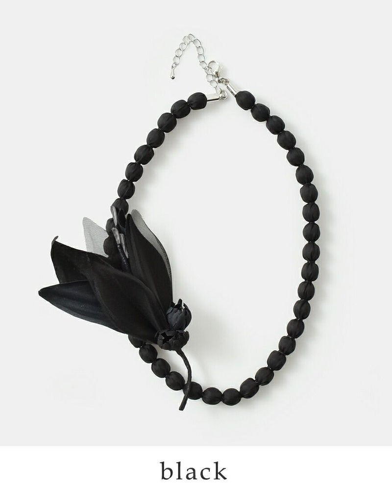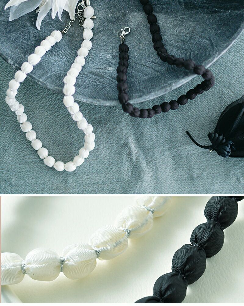 ネックレスはパールのようなシンプルな小粒ビーズに、光沢のある布を巻いて並べた印象的なデザイン。