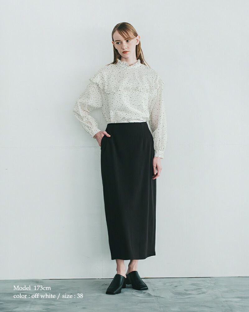 甘さを抑えた、大人のドット。品よく映えるフリルカラーブラウス。