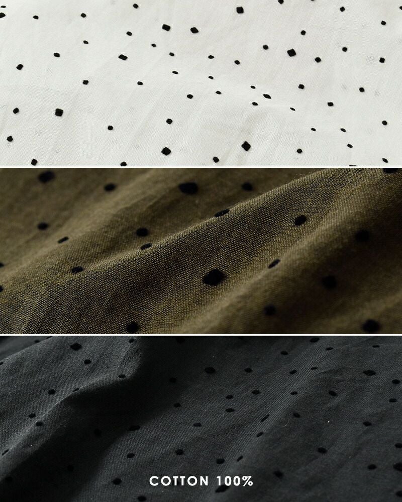 ドット部分にはレーヨン100%のフロッキー加工を施し、立体感と上品な表情をプラス。異素材のコントラストが、シンプルながらも奥行きのある一枚です。