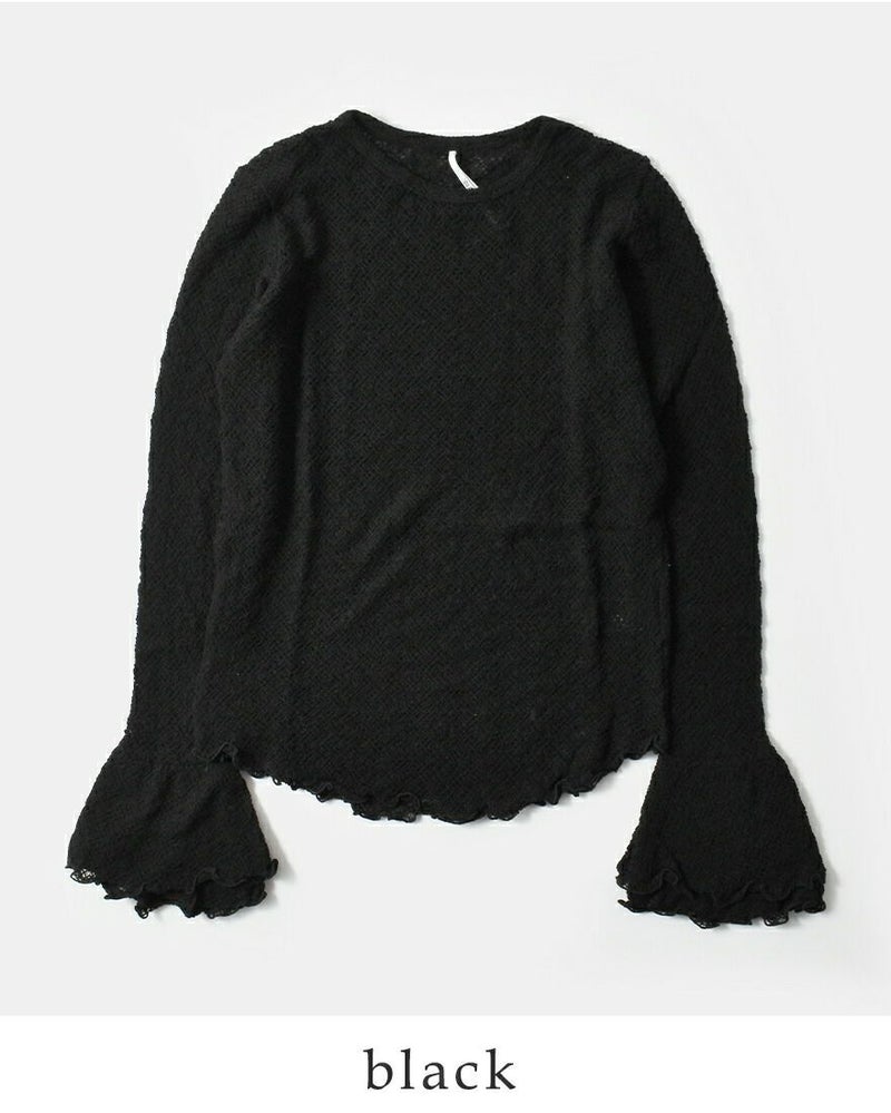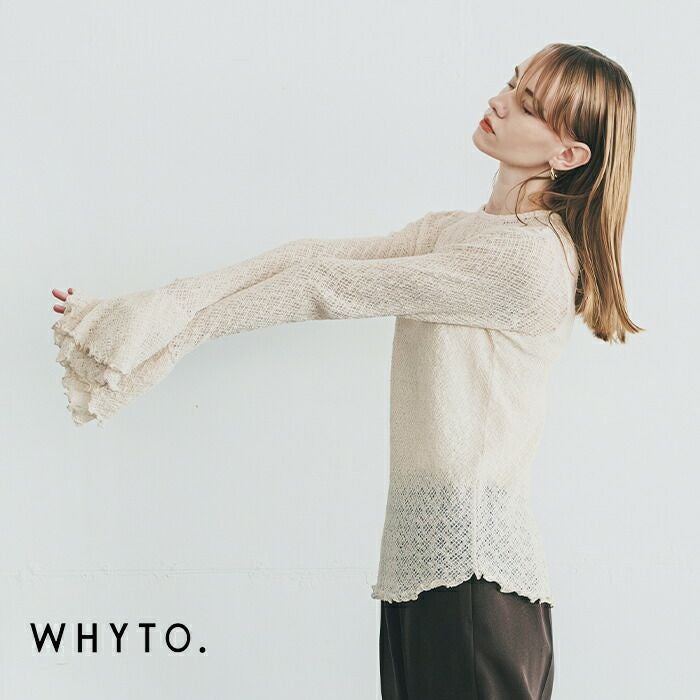 whyto(ホワイト)よりフリル フレア レース トップス “frill flare lace tops”のご紹介です。凹凸のある表情豊かなレースカットソーを使用した、レイヤードに活躍する一枚。ほどよい透け感があり、インナーとして取り入れるだけでスタイリングに奥行きをプラスします。袖先は切り替えを入れ、フリルフレアのボリューム感あるシルエットに仕上げ、動くたびにやわらかなニュアンスを演出。ジャケットやアウターの袖口からフリルを覗かせれば、トレンド感と華やかさをプラス。デニムやスラックスなどカジュアルなアイテムとのレイヤードも相性が良く、幅広いコーディネートが楽しめます。伸縮性にも優れており、見た目以上にストレスフリーな着心地も魅力です。
