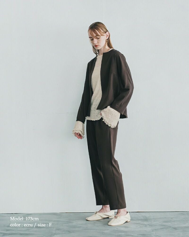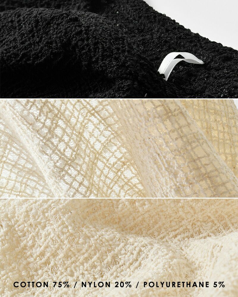 コットン 75% ナイロン 20% ポリウレタン 5% 凹凸感のあるレースカットソー生地を使用し、表情豊かな仕上がりに。程よい透け感と伸縮性を兼ね備え、見た目の繊細さとは裏腹に、快適な着心地を叶えます。