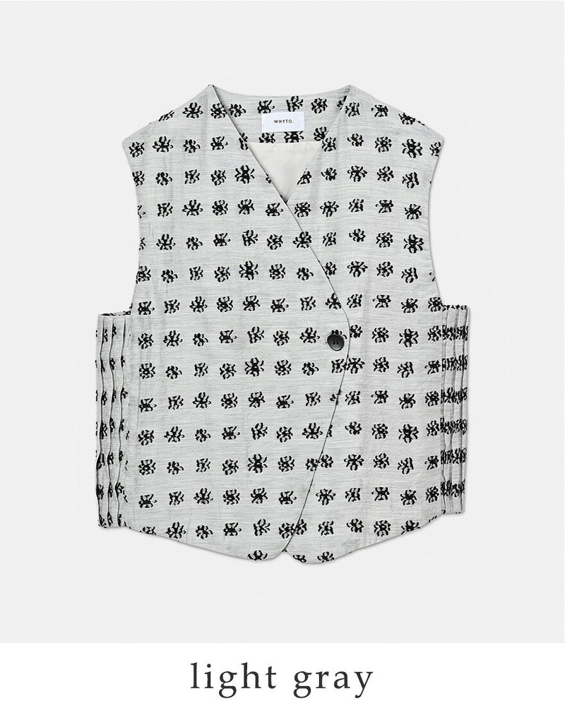 whyto(ホワイト)より、ジャガード アシンメトリー ベスト “jacquard asymmetry vest” のご紹介です。表面の凹凸モチーフが印象的なデザインベスト。フロントはアシンメトリーな重なり仕様で、甘さを抑えたマニッシュな雰囲気に仕上げています。脇パーツにはプリーツディテールを差し込み、動くたびに表情が変わるサイドデザインもポイント。レイヤード次第で印象を変えられ、スタイリングの幅が広がる使いやすい一着です。