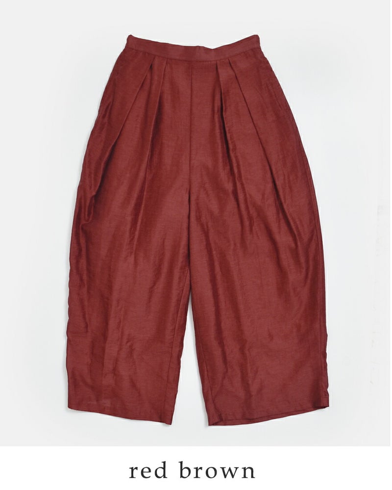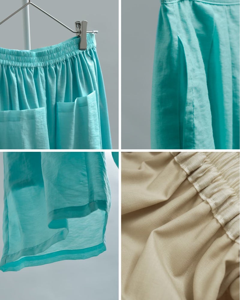 ヒップにかけて大きく取られたタックが、自然な丸みと立体感を生み出し、気になる腰まわりをさりげなくカバー。隠すのではなく、きれいに見せるためのボリューム設計です。後ろにはゴムが入っているので、リラックス感のある履き心地。ボタンやファスナーなどのないイージー仕様で、着脱もスムーズ。両サイドにポケット、後ろにはオープンポケットをあしらい機能性も◎。