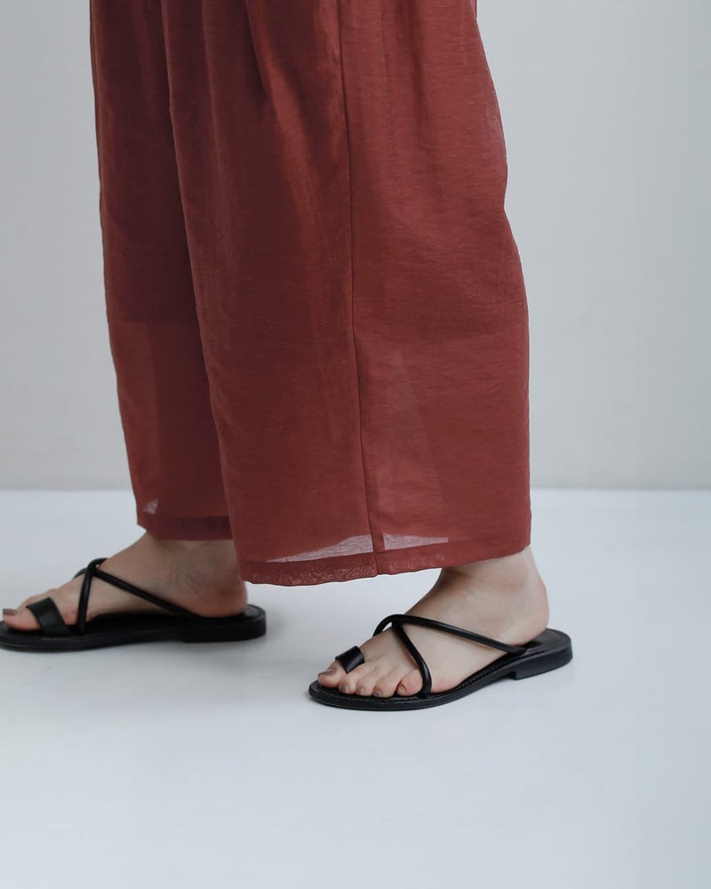 足首が見える丈感にすることで、重さを感じさせず、軽やかで抜け感のある印象に仕上がっています。ぺたんこサンダルとの相性も◎。