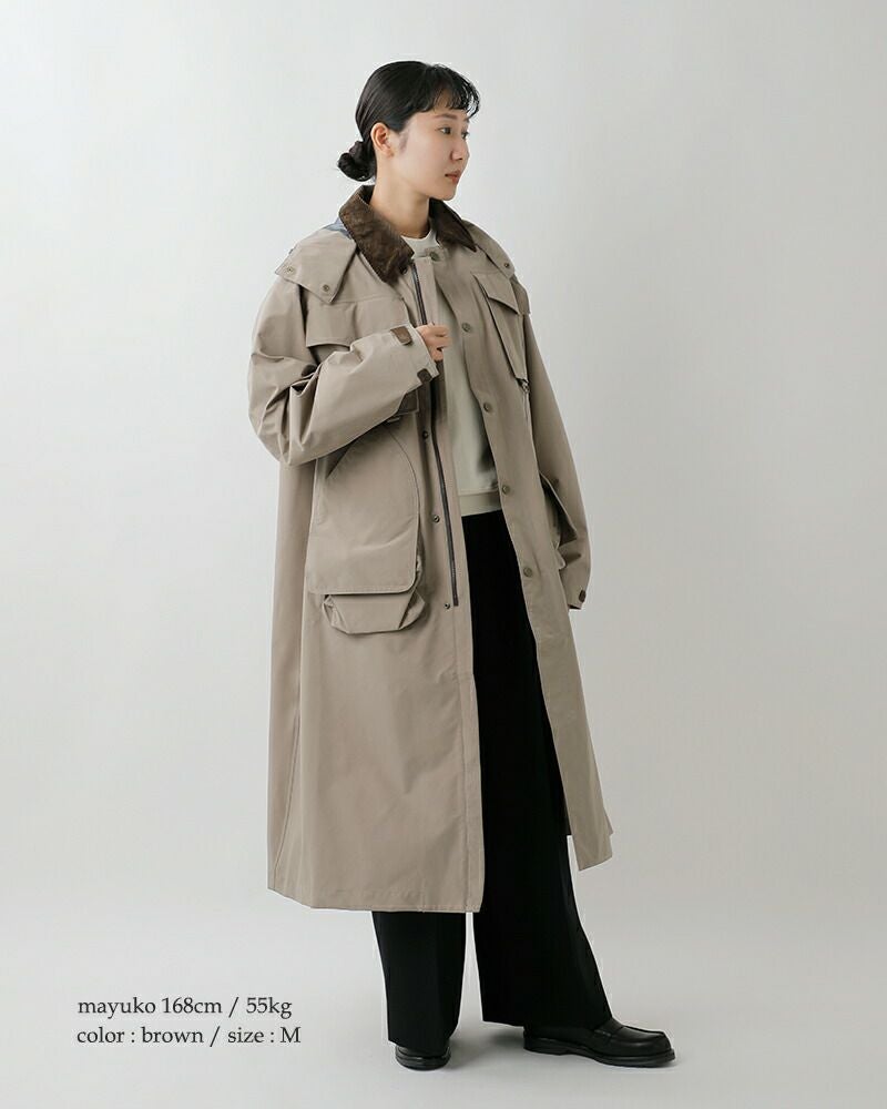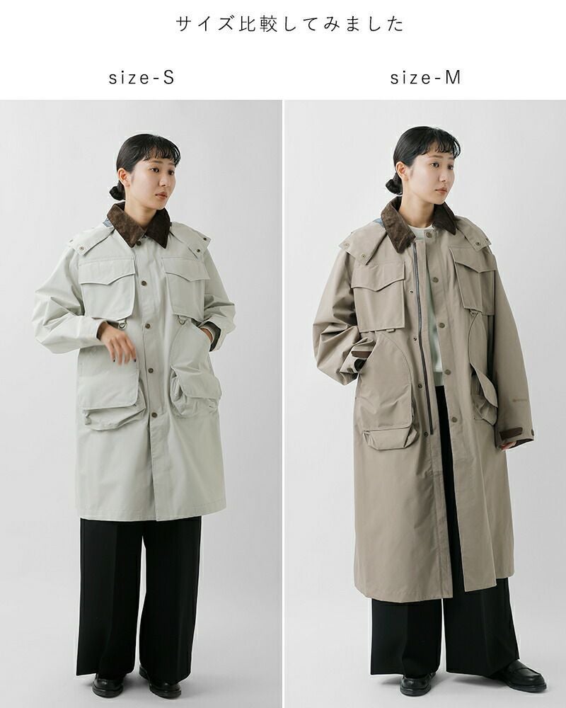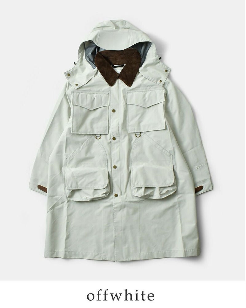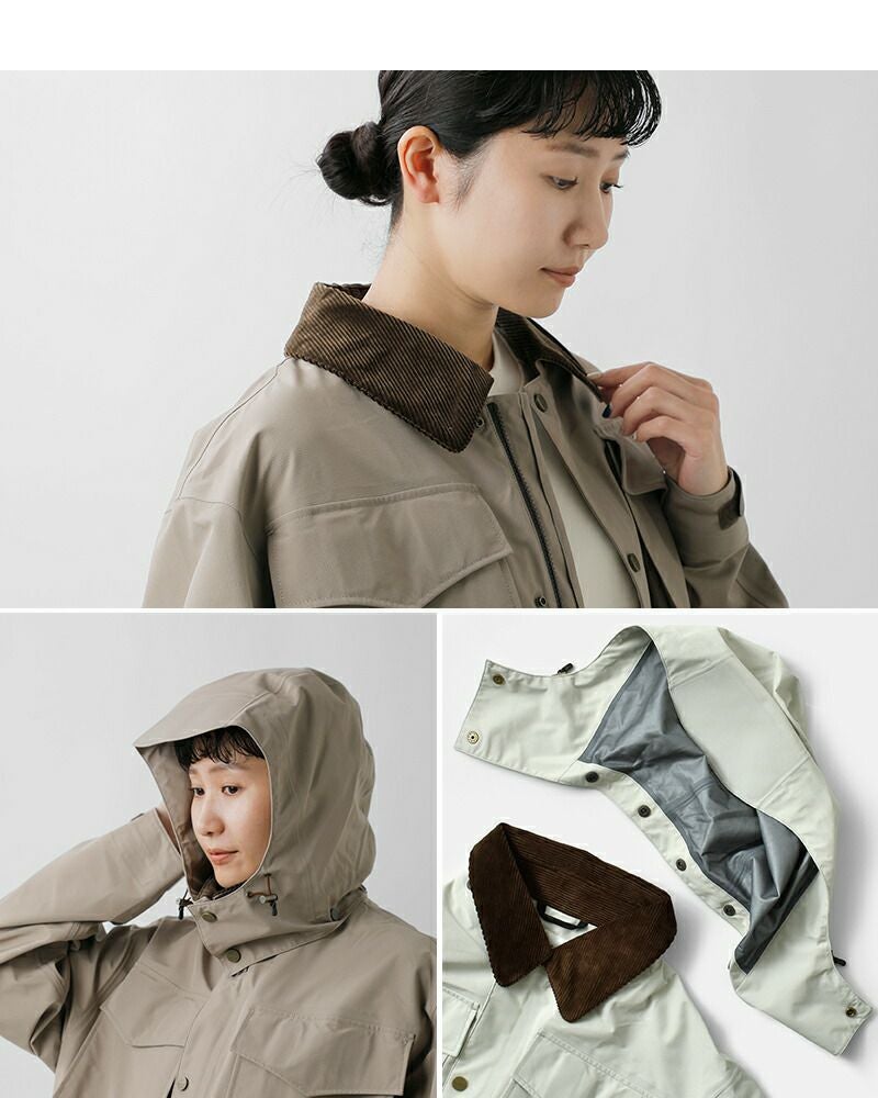 襟はコーデュロイ素材で切り替えてあたたかみのあるアクセントに。取り外し可能なフードは立体的で、フィット感を調節可能なドローコードに加え首元のボタンで、飴や風からも守ってくれるデザイン。