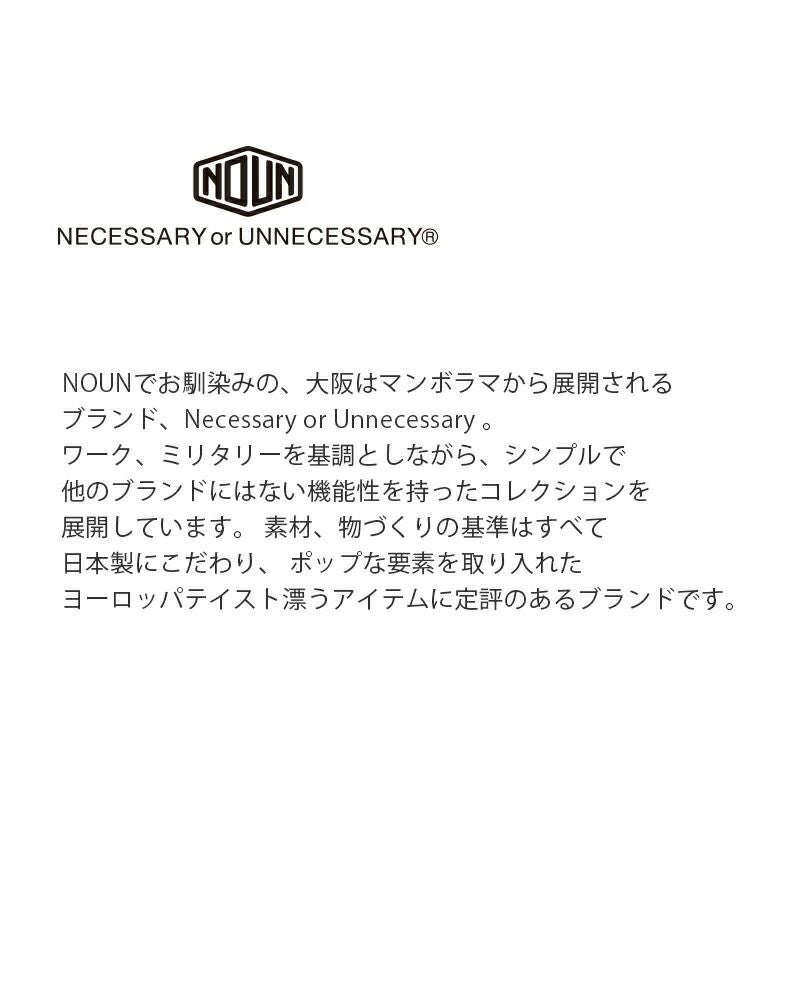NOUNでお馴染みの、大阪はマンボラマから展開される ブランド、Necessary or Unnecessary 。 ワーク、ミリタリーを基調としながら、シンプルで 他のブランドにはない機能性を持ったコレクションを 展開しています。 素材、物づくりの基準はすべて 日本製にこだわり、 ポップな要素を取り入れた ヨーロッパテイスト漂うアイテムに定評のあるブランドです。
