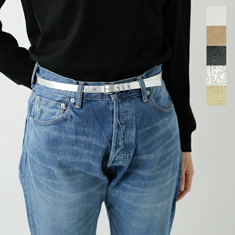 LEFIJE(レフィエ)より、カウレザーベルト“Tresor / Laminato”のご紹介です。ミニマルな佇まいのカウレザーに三連のメタルバックルが映えるベルト。しなやかで上質な本革を使用。onでも使いやすいプレーンカラーとoffにおすすめのメタリックカラーを揃えました。やや細めのベルト幅でパンツはもちろん、シャツやワンピースにウェストマークするだけでスタイリングにシャープさをプラスしてくれます♪