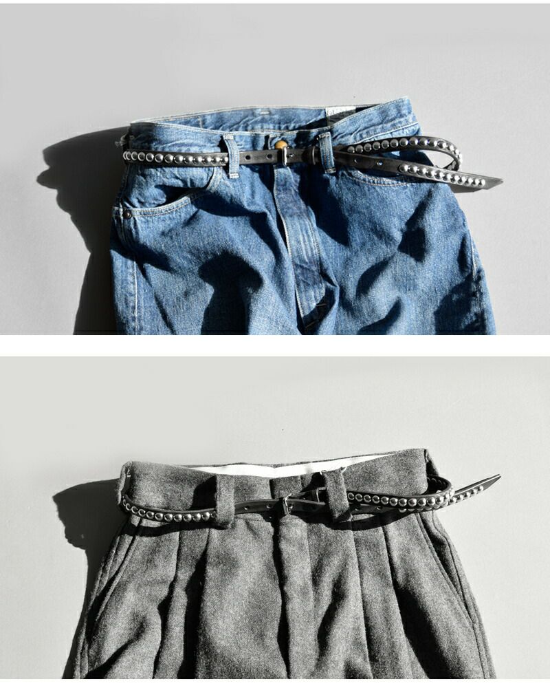 いつものシンプルコーデに、スタッズベルトをオンするだけで、ひと際存在感を放ちます。